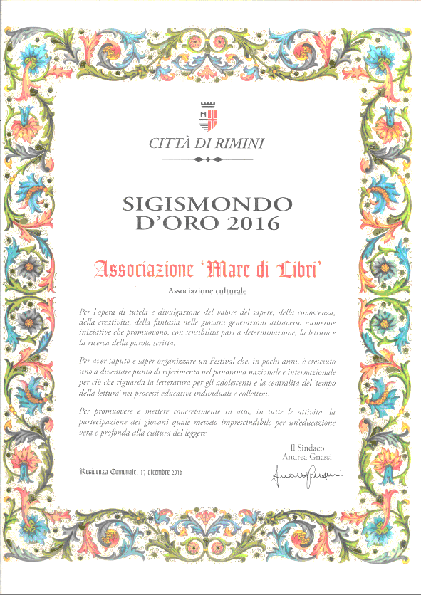 Associazione Mare di Libri, premiata con il Sigismondo d'Oro 2016 per il suo impegno nella promozione della lettura tra i giovani attraverso festival e iniziative culturali