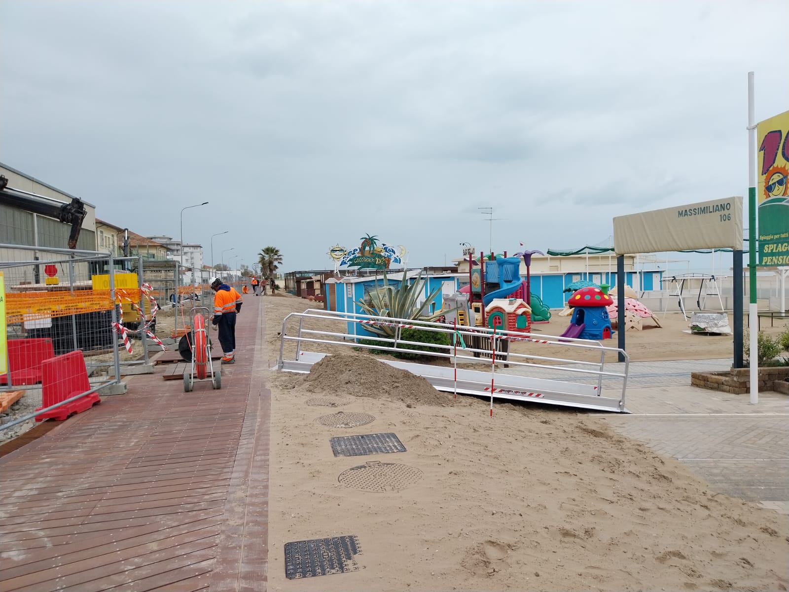 I varchi aperti, con camminamenti sul dek, saranno garantiti per tutta la durata dei ponti di primavera, terminati i quali verranno riorganizzati per consentire agli operatori di accedere alla spiaggia e garantire il prosieguo del cantiere.