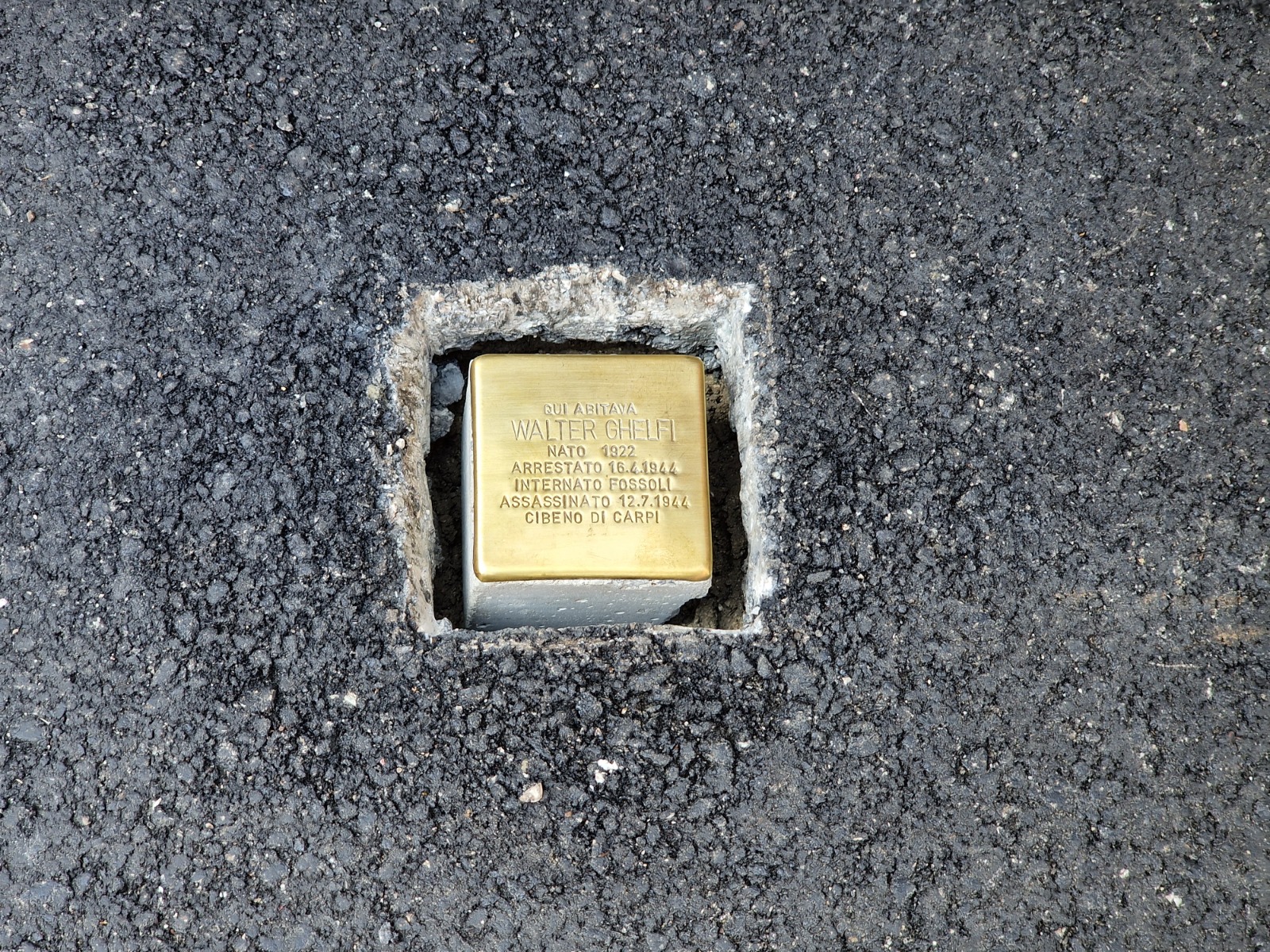Ricordiamo che la pietra d'inciampo, in memoria del ferroviere riminese Walter Ghelfi, è stata collocata davanti al civico 30 di via Clodia, l'indirizzo della sua casa alla data di quel fatale eccidio nell’estate del ’44, quando venne fucilato nel Poligono di tiro di Cibeno, vicino a Fossoli, dove era stato deportato. Walter Ghelfi (nato a Rimini, il 3 agosto 1922) fu Commissario Politico della Compagnia Armi Pesanti della VIII Brigata Garibaldi. Dopo i duri combattimenti di Pasqua 1944 sull'Appennino romagnolo con la Divisione corazzata Hermann Göring, fu incaricato di proteggere la ritirata di 80 combattenti malati e feriti. Catturato il 16 aprile del 1944, fu condotto prima a Forlì, poi al Campo di polizia e transito di Fossoli, e lì fucilato – il 12 luglio 1944 – nel vicino Poligono di tiro di Cibeno. 67 in tutto furono le vittime di quell’eccidio, uomini di diverso orientamento ideale e politico, accomunati dall’opposizione al nazifascismo, che lottavano per una società più giusta e per la libertà dalle dittature.