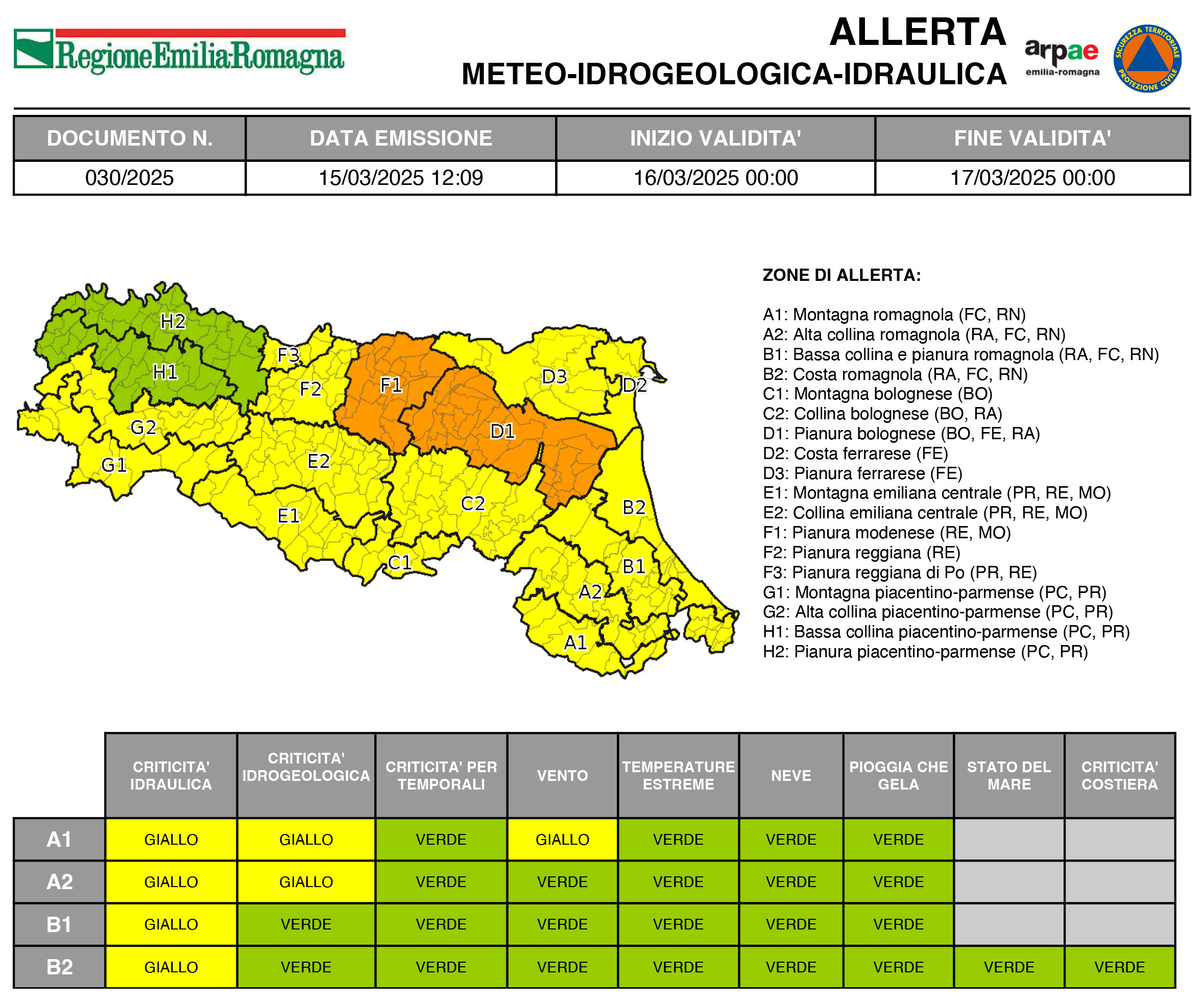 La Protezione civile regionale dell’Emilia Romagna ha emesso allerta meteo “gialla” per criticità idraulica per domani 16 marzo che riguarda l’area di riferimento “B2” che ricomprende il Comune di Rimini.