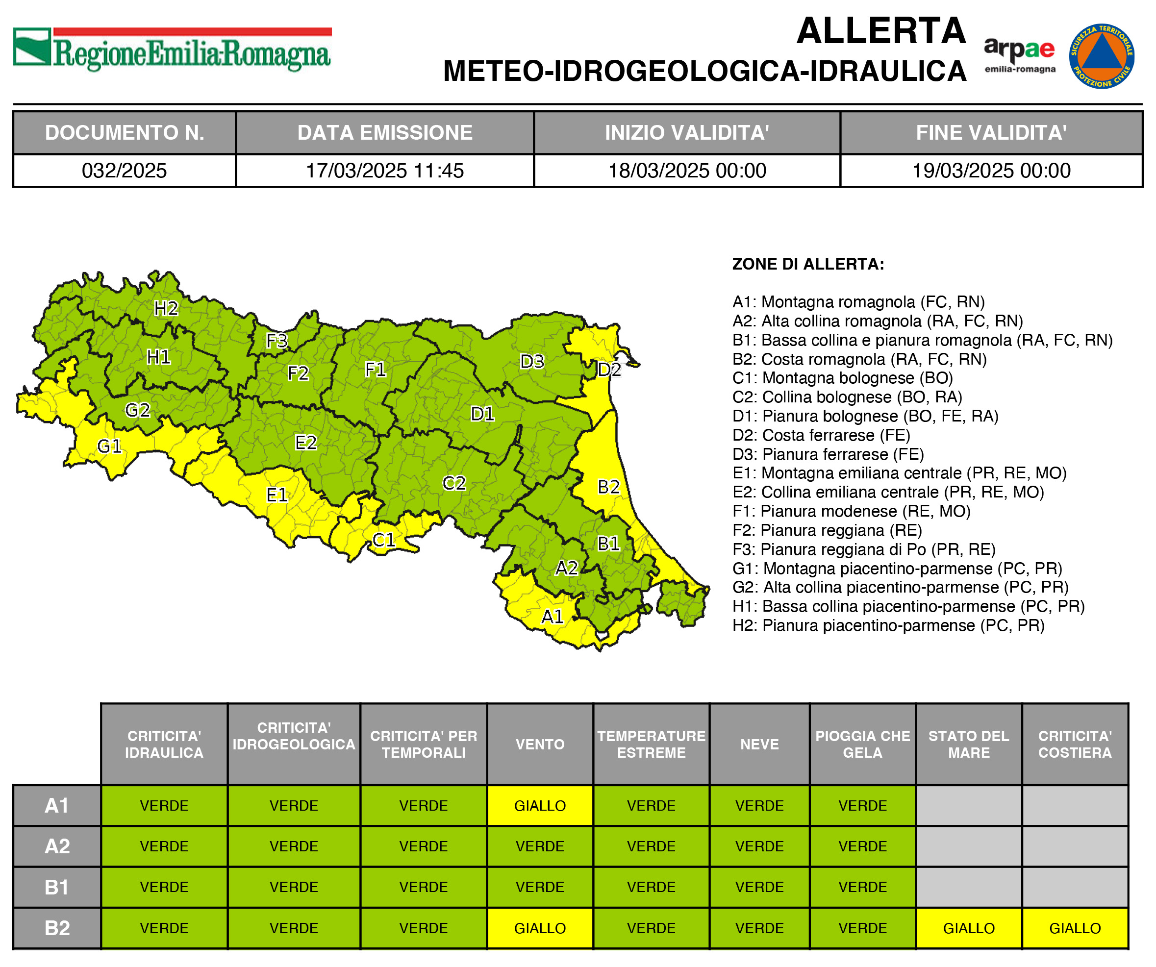 Dalle prime ore della giornata di martedì 18 marzo sono previsti venti di burrasca moderata (62-74 km/h) da nord est, con possibili rinforzi o raffiche di intensità superiore sulla fascia costiera, sul mare e sul crinale appenninico. Il mare è previsto agitato al largo. Il vento sulla costa, sul mare ed il moto ondoso saranno in attenuazione dalla tarda mattinata, mentre sul crinale appenninico la ventilazione sostenuta permarrà per l'intera giornata. Nelle prime ore della mattina saranno possibili localizzati fenomeni di erosione e di allagamento dei litorali. Nelle zone montane e collinari non si escludono occasionali fenomeni franosi sui versanti caratterizzati da condizioni idrogeologiche particolarmente fragili, a seguito delle precipitazioni dei giorni precedenti.