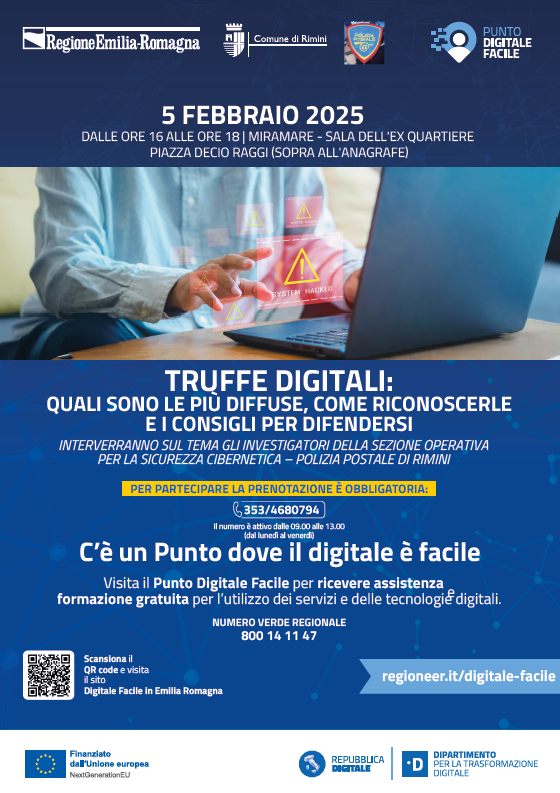 Per affrontare questo attualissimo e critico problema, il progetto “Rimini: il digitale a portata di mano” organizza un incontro informativo gratuito dal titolo “Truffe digitali: le più comuni, come riconoscerle e come difendersi”.