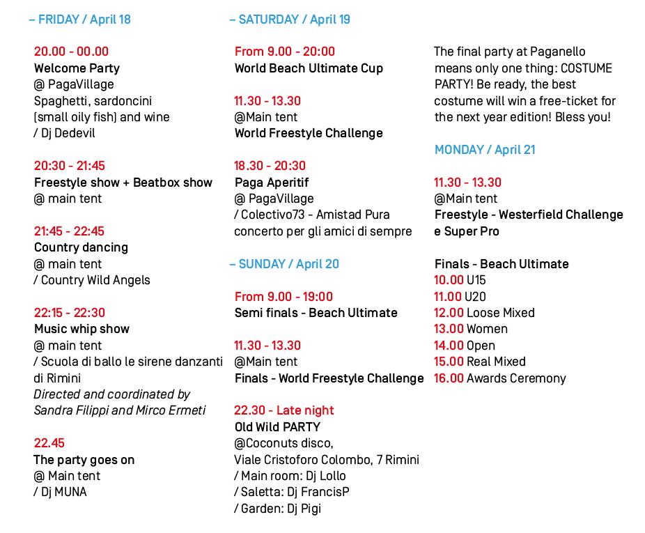 Sono in corso in queste ore gli ultimi allestimenti dei campi, delle aree di gioco e del Paga Village, in attesa di questa sera -venerdì 18 aprile alle ore 20- per il Welcome Party in spiaggia che si vestirà a tema western con balli country a cura di Country Wilde Angels mischiati alle esibizioni di danze romagnole a cura delle Sirene Danzanti coordinati da Mirco e Sandra. Nel week-end di Pasqua, a partire dalle ore 9, Rimini viene presa d'assedio dai ‘dischi volanti’ del Paganello, la Coppa del Mondo di Beach Ultimate, ovvero lo sport del frisbee giocato sulla sabbia con le sfide fra 150 squadre da tutto il mondo e 2500 partecipanti. Si potrà assistere anche alle competizioni di “freestyle”, la disciplina più spettacolare ed artistica con il disco.