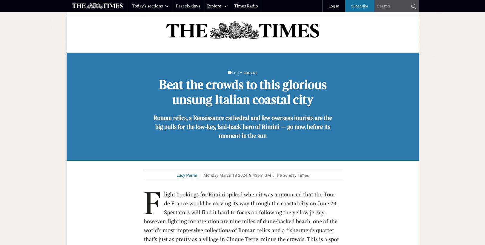 "15 chilometri di spiaggia e una delle collezioni romane più belle al mondo": è questa la Rimini “gloriosa” descritta dal quotidiano inglese Times