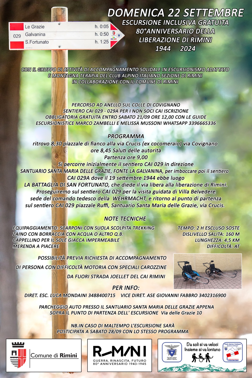 Tra le altre iniziative in programma: la presentazione del gioco da tavolo storico “Rimini Libera. 21 settembre 1944. La nostra Resistenza!”, una camminata attraverso i luoghi simbolici della battaglia sul colle di Covignano, una regata con partenza dal porto canale di Rimini, e ancora presentazioni di libri e l’inaugurazione di un totem monumentale in ricordo di Amedeo Montemaggi, celebre cittadino riminese, storico della Linea Gotica.