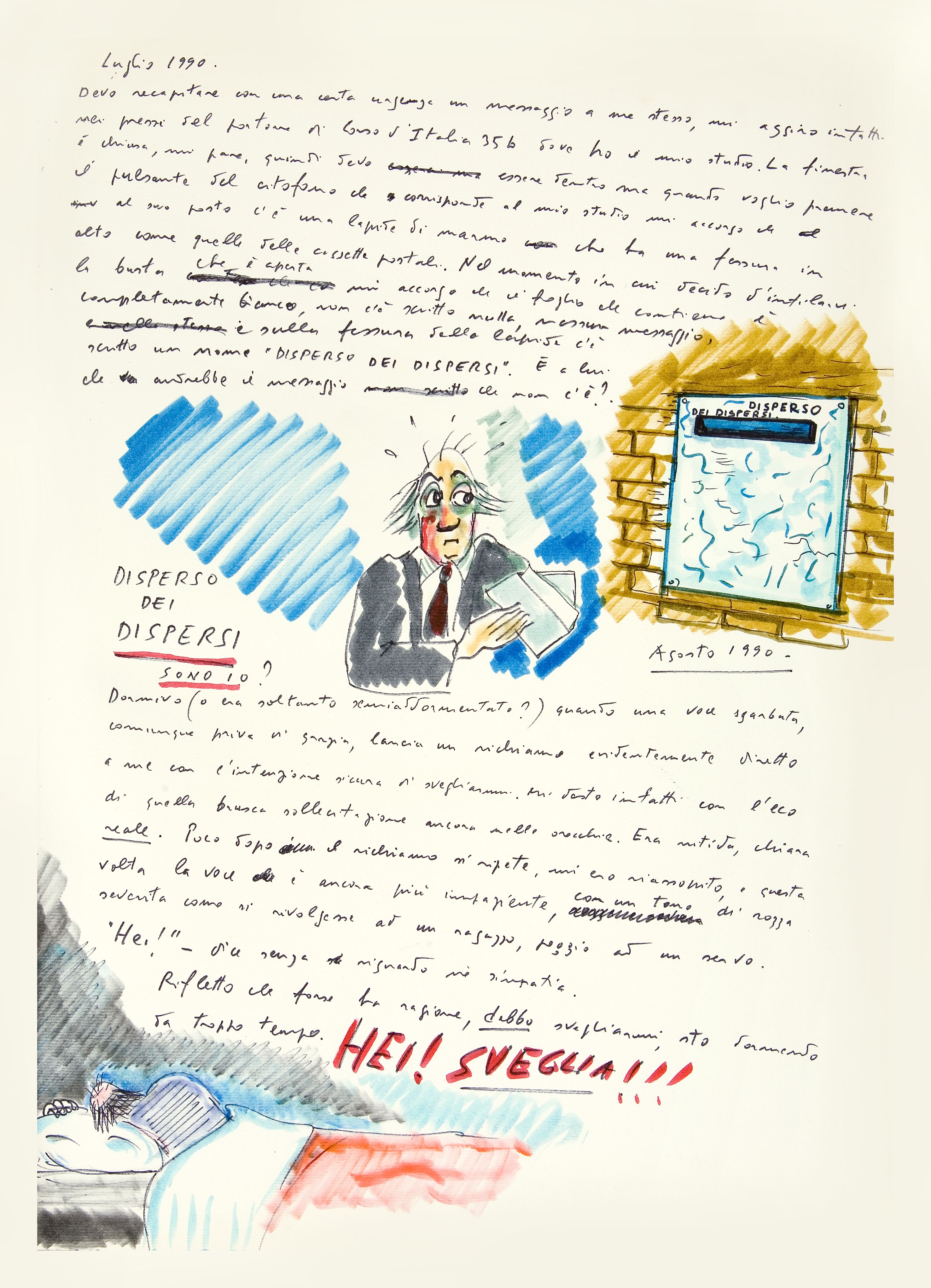 Inquietante, per quanto è premonitore, è invece il sogno del luglio del 1990, che forma con quello immediatamente successivo il dittico di chiusura della raccolta, nei due leggendari album, dei disegni onirici di Fellini. In questo sogno, noto per la didascalia kafkiana “disperso dei dispersi” che ne domina la raffigurazione, l’autore di 8½ deve recapitare a sé stesso una lettera, ma al posto della cassetta postale del suo studio trova una lapide con quell’iscrizione e scopre che il foglio da imbucare è bianco. Una consegna dunque senza destinatario, un messaggio senza contenuto: è con questo senso di smarrimento che Fellini prende congedo dal mondo dei suoi sogni, dalla fonte principale di ispirazione del suo cinema.