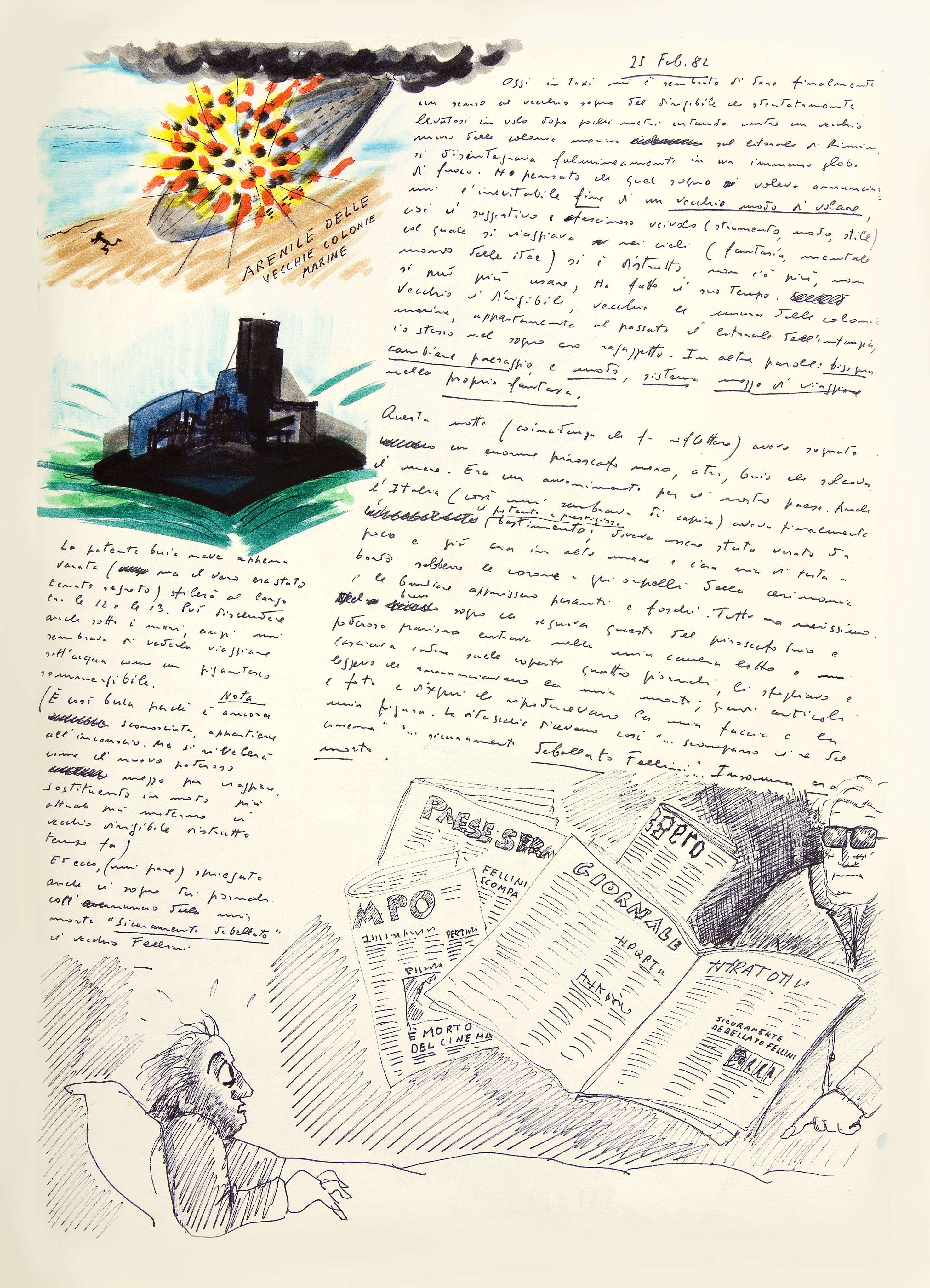 È il 25 febbraio del 1982 e i quotidiani riportano in prima pagina la notizia della morte di Federico Fellini: “Fellini scomparso”, “È morto il re del cinema”, “Sicuramente debellato Fellini”, sono i titoli di alcuni articoli di quella mattina. Quell’annuncio, nella realtà, i giornali non lo fecero mai: è Fellini a sognarlo. E, per quello che possiamo leggere nel Libro dei sogni, non fu quella la prima volta che il regista riminese prefigura in sogno la propria morte e non sarà neppure l’ultima.