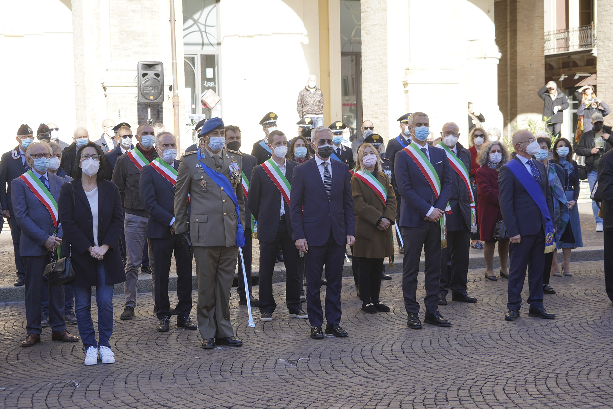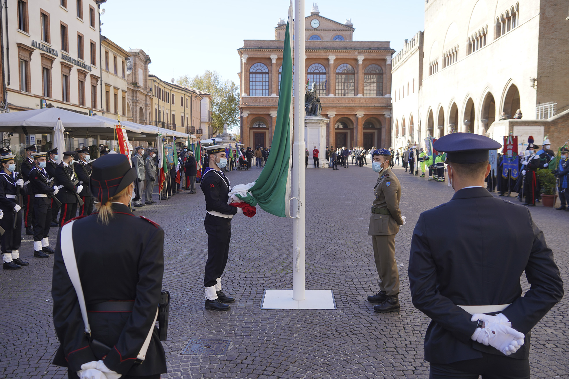 Un momento commemorativo a cui hanno fatto seguito le celebrazioni ufficiali in piazza Cavour con la partecipazione dei rappresentanti delle istituzioni, delle Forze armate delle associazioni combattentistiche e dei cittadini che hanno voluto partecipare alla manifestazione. Dopo gli onori al Prefetto di Rimini con la rassegna dello schieramento in armi, ha fatto seguito in piazza Cavour la cerimonia dell'alzabandiera e la deposizione di una corona alla lapide dedicata ai caduti di tutte le guerre.