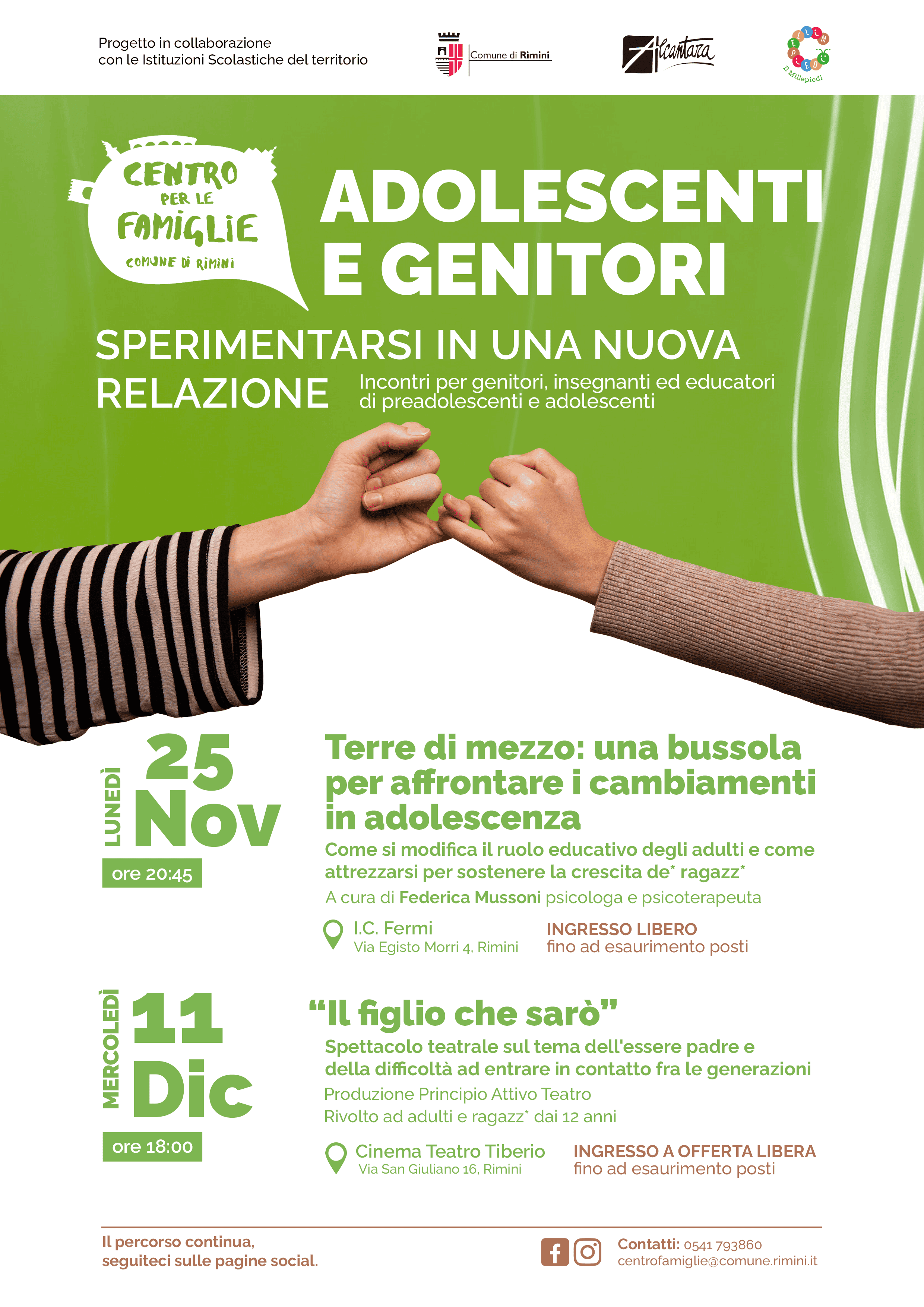 Due incontri di apertura, in programma per la settima edizione di “Adolescenti e genitori: sperimentarsi in una nuova relazione”, percorso rivolto a genitori, insegnanti ed educatori di giovani preadolescenti e adolescenti.