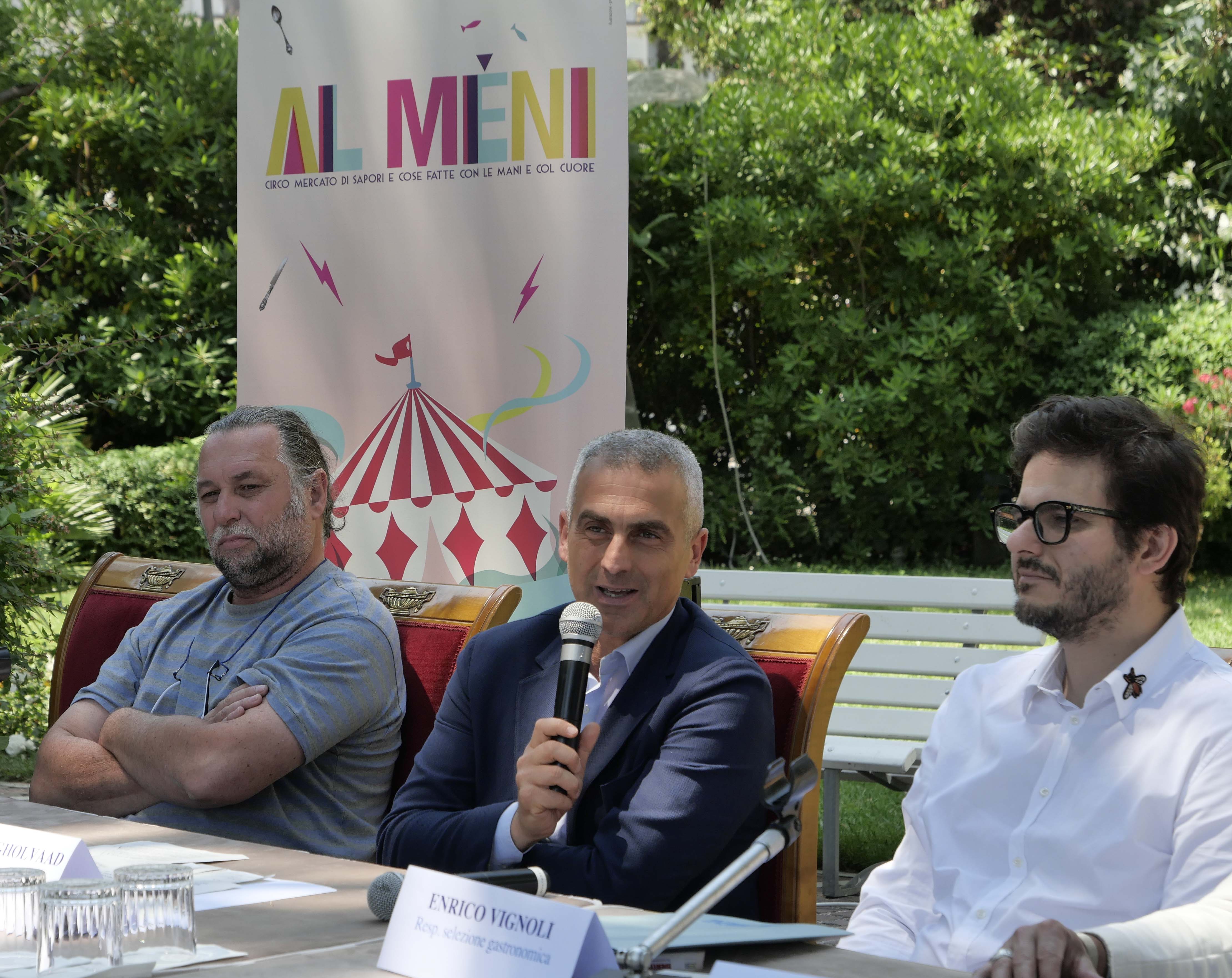 Attorno al Circo 8 e ½ ci saranno speciali punti street food gourmet che portano il meglio della produzione artigiana nella rotonda di piazzale Fellini. La postazione dello chef Alberto Faccani coordinerà le mani dei cuochi di CheftoChef emiliaromagnacuochi alle prese con la cucina da strada, come gli chef di Francescana, Franceschetta, Omar Casali (Marè) e Riccardo Agostini (Il Piastrino). Quest’anno Faccani avrà un ospite speciale, l'associazione del Tortellante, un laboratorio terapeutico – abilitativo dove giovani e adulti nello spettro autistico imparano a produrre pasta fresca fatta a mano. Il progetto, avviato a gennaio 2016 e integrato da attività abilitative e formative per migliorare le autonomie, si è dimostrato anche una buona pratica di inclusione. La presenza del ristorante Quartopiano di Rimini, che è da anni la “terrazza sulla città”, vedrà lo chef Silver Succi dare forma e sostanza alla sua idea di street food portando il suo progetto gastronomico cosmopolita, pur nel solco della tradizione romagnola. Il gruppo composto da La Sangiovesa e Tenuta Saiano parteciperà congiunto, portando ad Al Mèni la bottega di Santarcangelo di Romagna “Via Saffi 32”, laboratorio di pasticceria e lievitati salati e spaccio della Tenuta Saiano. Questa realtà, guidata dal pasticcere Andrea Marconi, non è infatti solamente il laboratorio dove si producono i dolci de La Sangiovesa, ma anche un piccolo locale dove si possono consumare focacce e tigelle. Ad Al Meni Andrea presenterà una selezione delle sue focacce farcite con i prodotti della tenuta agricola. I pescatori riminesi saranno protagonisti con i loro piatti a base di fritto di pesce, spiedini di gamberi e calamari, risotto alla marinara e l’immancabile piada con la postazione ‘vista mare’ targata ‘Associazione Rimini per tutti’. Gin Mare e Cuori Ebbri firmano uno spazio innovativo dove saranno proposti dei drink ideati appositamente per Al Meni e serviti abbinati ai piatti di ispirazione territoriale e contemporanea. La regina dei vini riminesi nella bottiglia firmata Rebola si muove da protagonista ad Al Meni, nello spazio targato ‘Strada dei Vini e dei Sapori dei Colli di Rimini’ dove si potrà trovare il gusto più puro della tradizione vitivinicola del territorio di Rimini. Quest’anno per il suo 25esimo anniversario non poteva mancare la Birra Amarcord che torna ad Al Mèni con una postazione piena di eventi a sorpresa dove poter festeggiare e degustare le sue birre bionda, scura o rossa, ottenuta da malto d’orzo italiano e “know how” riminese, con una proposta di abbinamento perfetta sia per lo street food che per l’alta cucina. Immancabile la regina di Romagna, la piada, stesa dalle mani esperte della Lella, una istituzione per i cultori del piatto più riminese che ci sia.