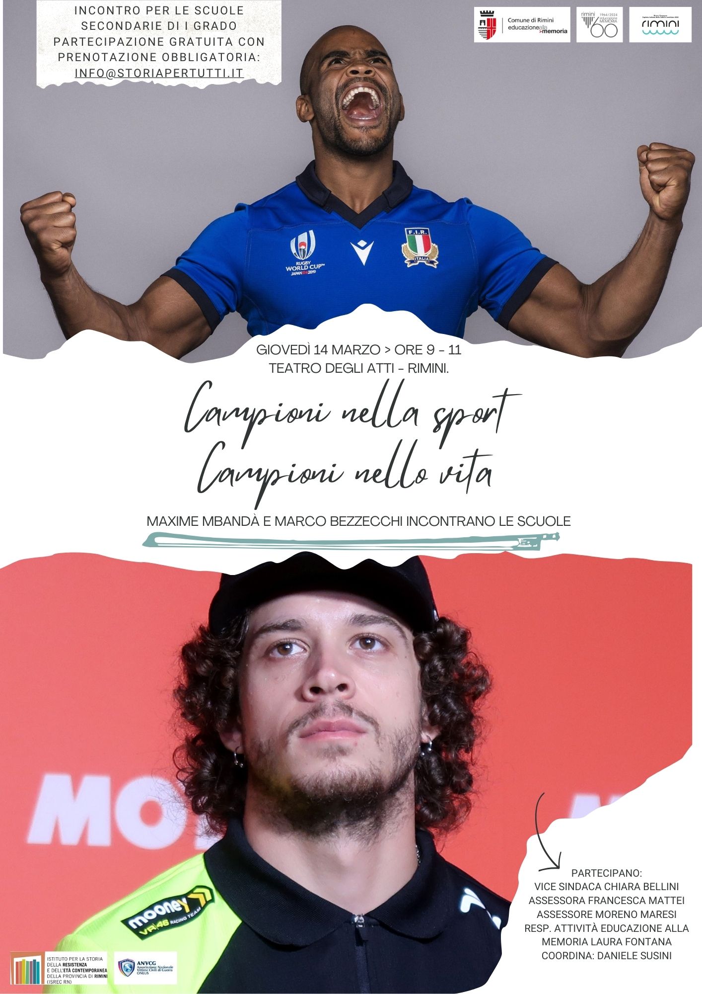 Sono arrivate a 260 le iscrizioni degli studenti che giovedì prossimo - 14 marzo - incontreranno al Teatro degli Atti due grandi campioni come, il rugbysta Maxime Mbanda, e il campione riminese di motociclismo, Marco Bezzecchi. Un evento organizzato per il progetto dei "Giusti fra le nazioni", nell'ambito delle Attività di Educazione alla Memoria del Comune di Rimini.