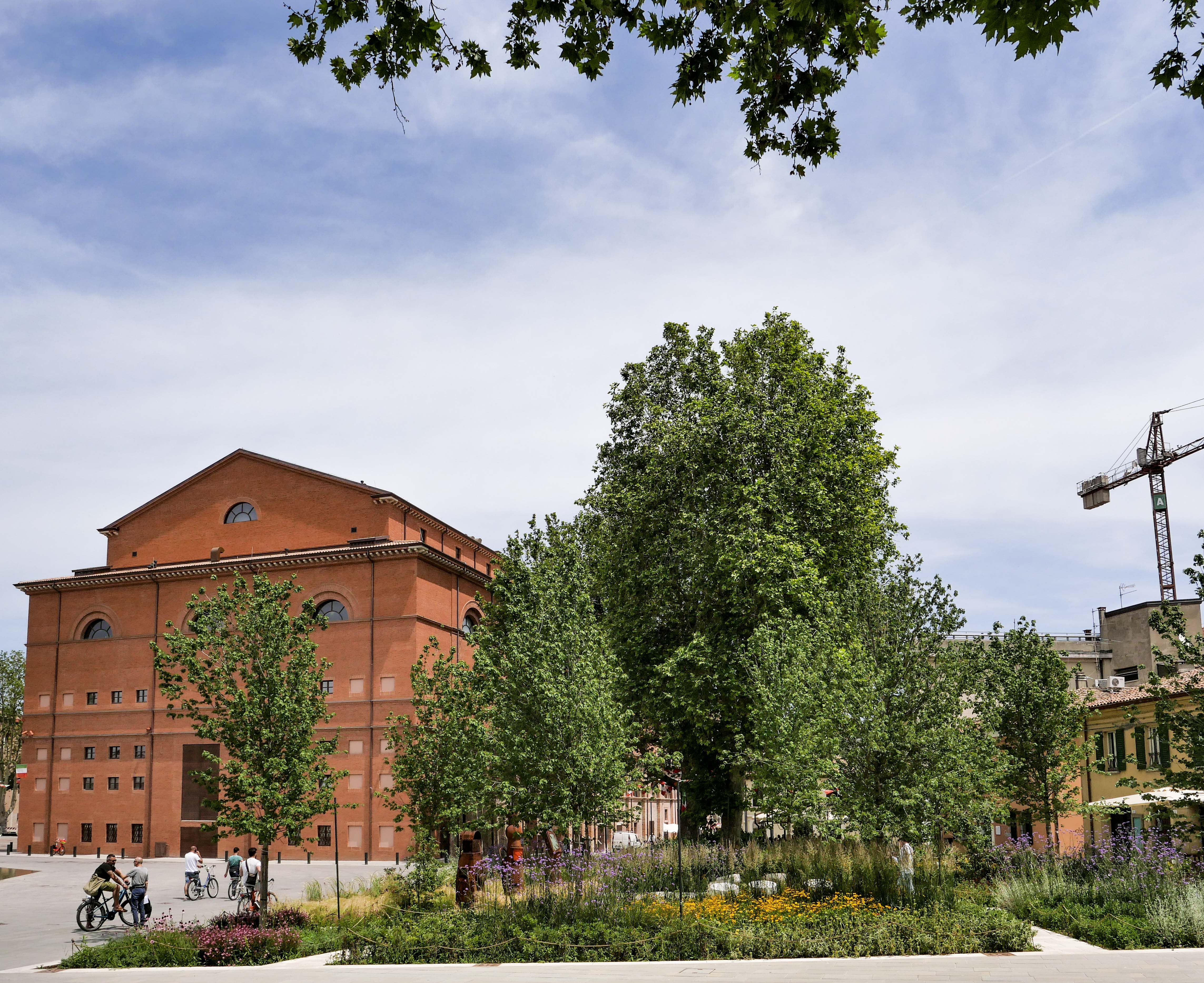 O come il “Bosco dei nomi” in piazza Malatesta, che fa parte del progetto dell’outdoor del Fellini Museum: un triangolo di campagna nel cuore della città che unisce idealmente Rimini alla Valmarecchia e che è un omaggio a Tonino Guerra e al suo imprescindibile contributo ad Amarcord. In ogni stagione il “Bosco dei nomi” assume colori diversi che danno una luce sempre nuova ai fiori di pietra su cui sono incisi i nomi di grandi personaggi del cinema, tra cui Federico Fellini e Giulietta Masina e alle lanterne magiche dedicate allo scrittore russo Lev Tolstoj: artisti e creatori di bellezza che ispirano il passaggio dei viandanti. Il verde scelto aggiunge racconto al luogo, la disposizione degli aceri con il platano storico, la vegetazione spontanea nei percorsi sterrati e nei sentieri bianchi conferisce all’insieme poesia e movimento.