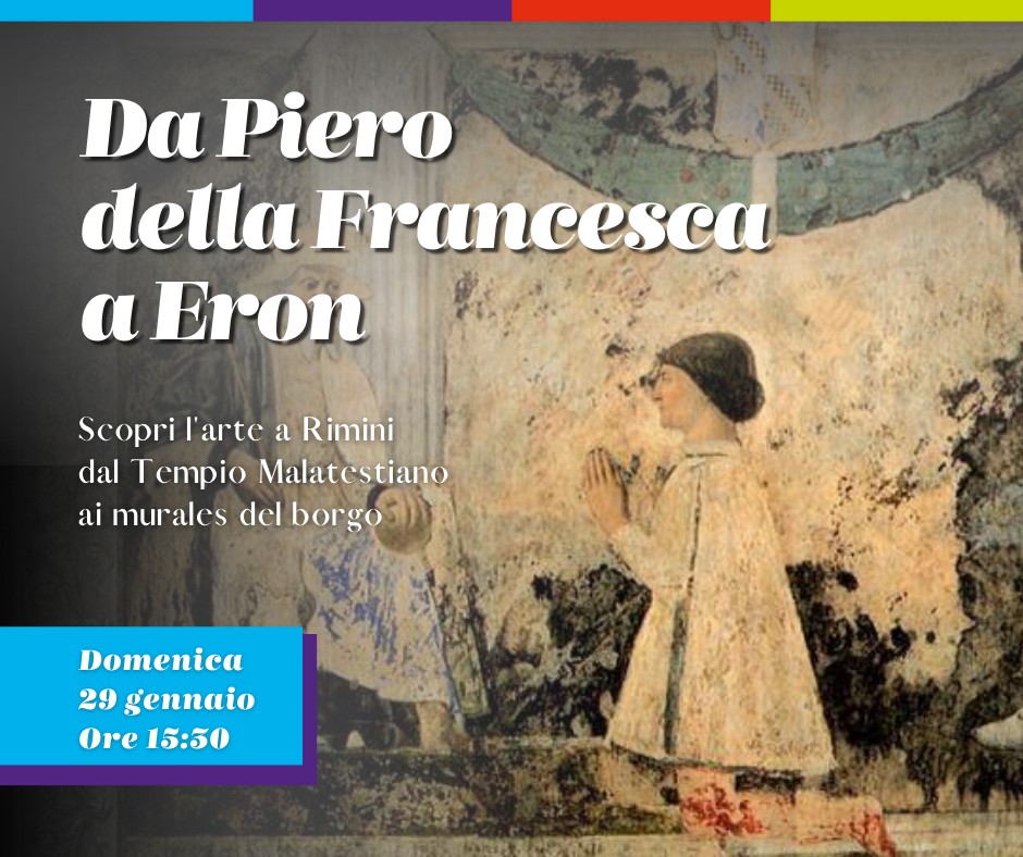 Ma le opportunità continuano con i City Tour di VisitRimini, che ogni domenica propongono un percorso alternativo. Domenica 29 gennaio si andrà alla scoperta della pittura muraria a Rimini con una visita dal titolo ‘Da Piero della Francesca a Eron e ai murales del borgo San Giuliano’. Un percorso che passa dall'affresco, con la visita al Tempio Malatestiano, in cui si può ammirare l'affresco commissionato da Sigismondo Pandolfo Malatesta a Piero della Francesca nel 1451 per commemorare il giorno in cui Sigismondo diventò il Signore della città di Rimini, ai murales, con il tour che prosegue verso il borgo San Giuliano dove i murales abbelliscono i muri delle antiche abitazioni e dove si parlerà della tecnica del murales e del grande artista Eron, uno dei migliori street artist italiani.