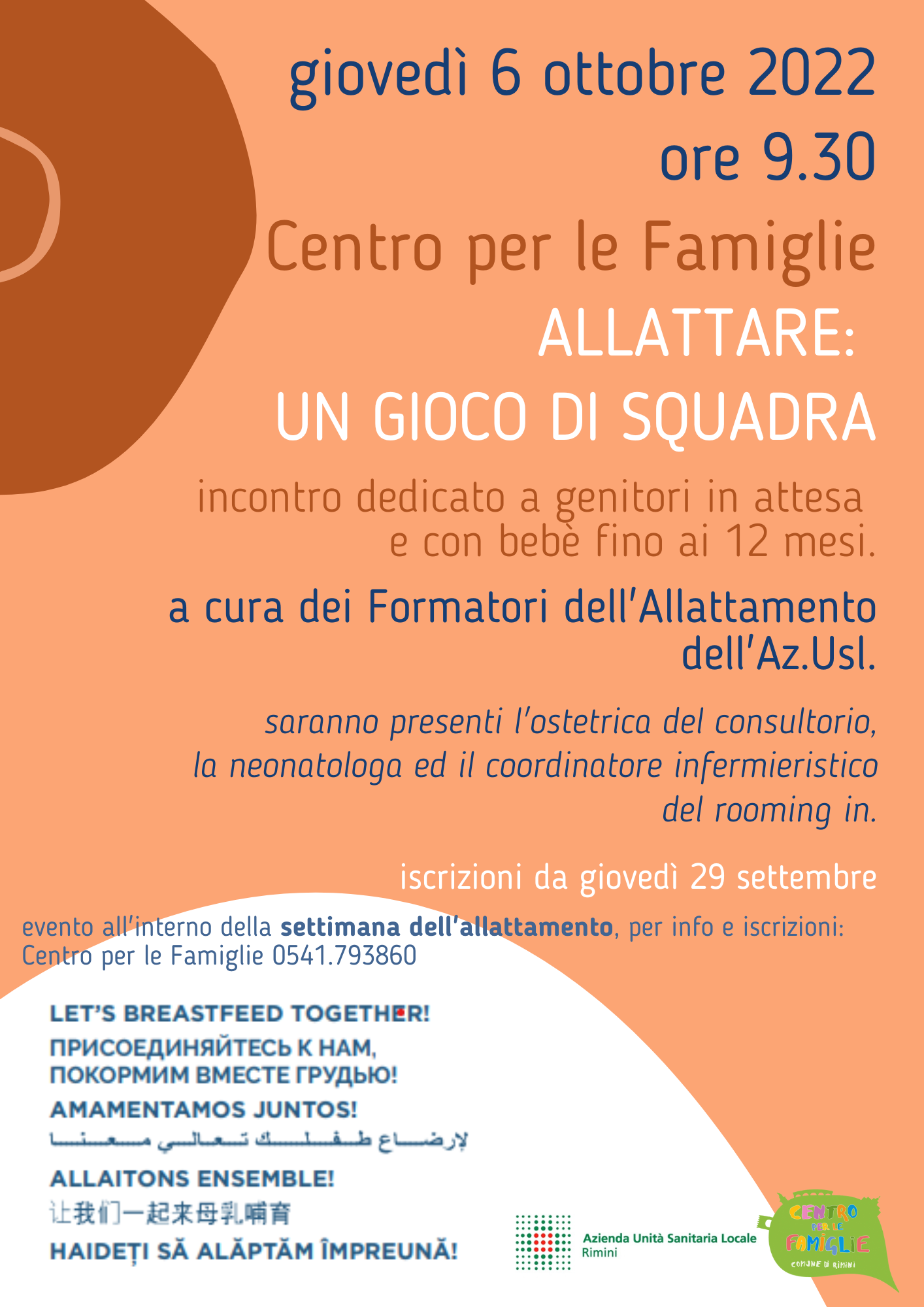 Giovedì 6 ottobre alle ore 9.30 il Centro per le Famiglie di Rimini ospiterà un appuntamento dal titolo "Allattare: un gioco di squadra" a cura dei Formatori dell'Allattamento dell'Azienda Usl del territorio.