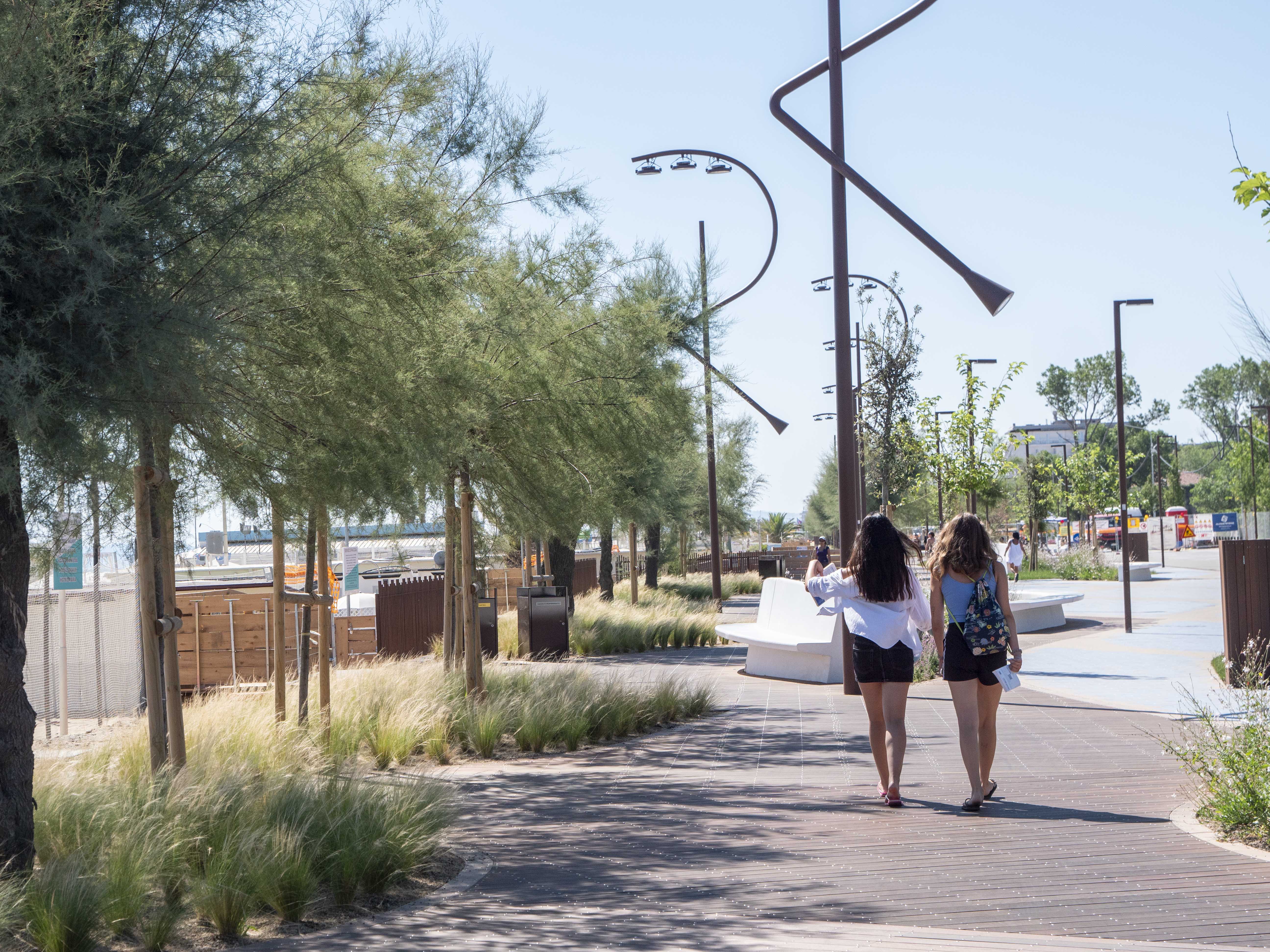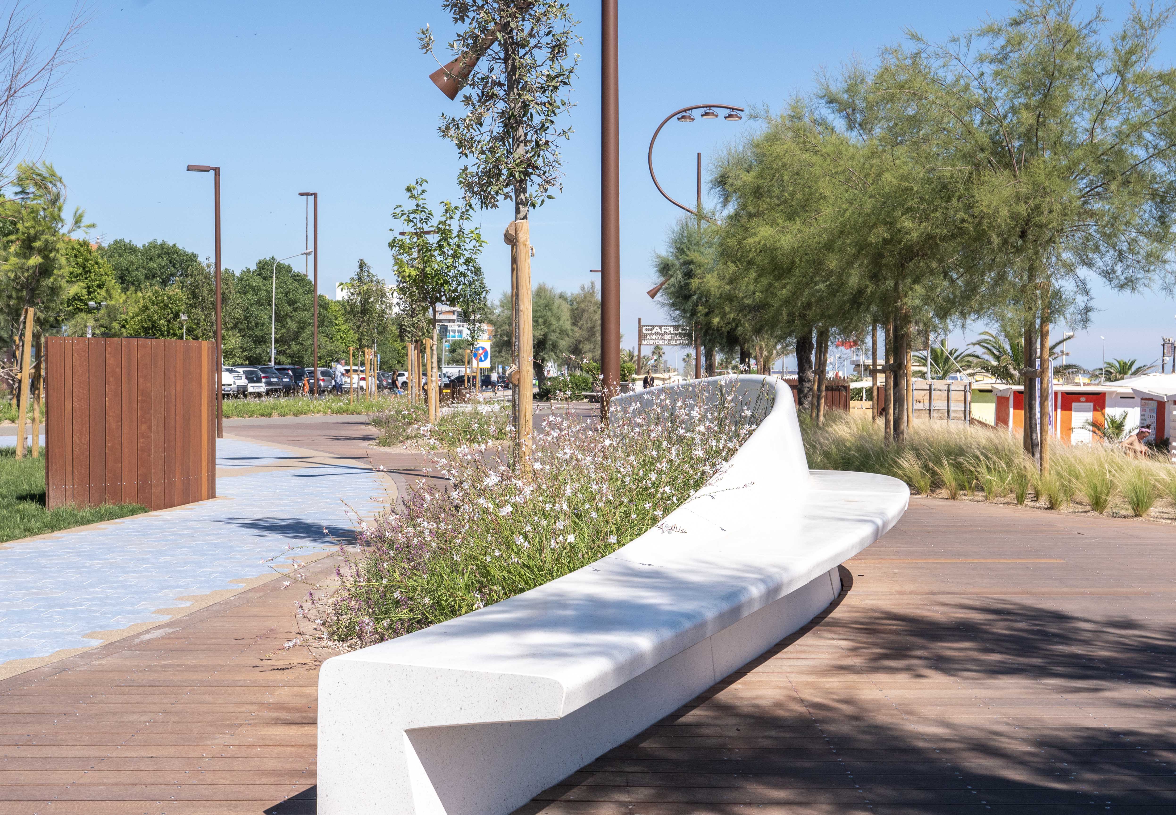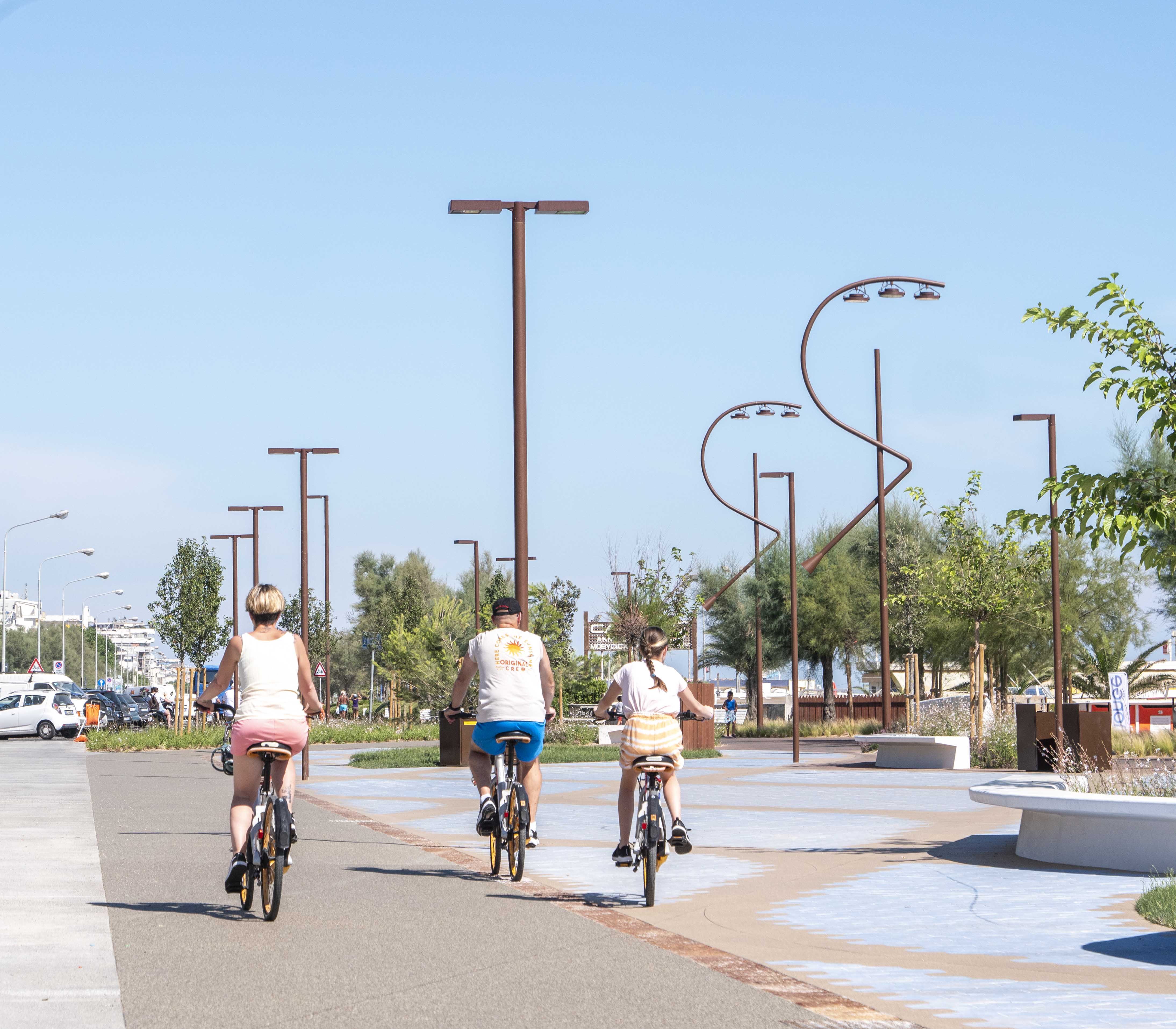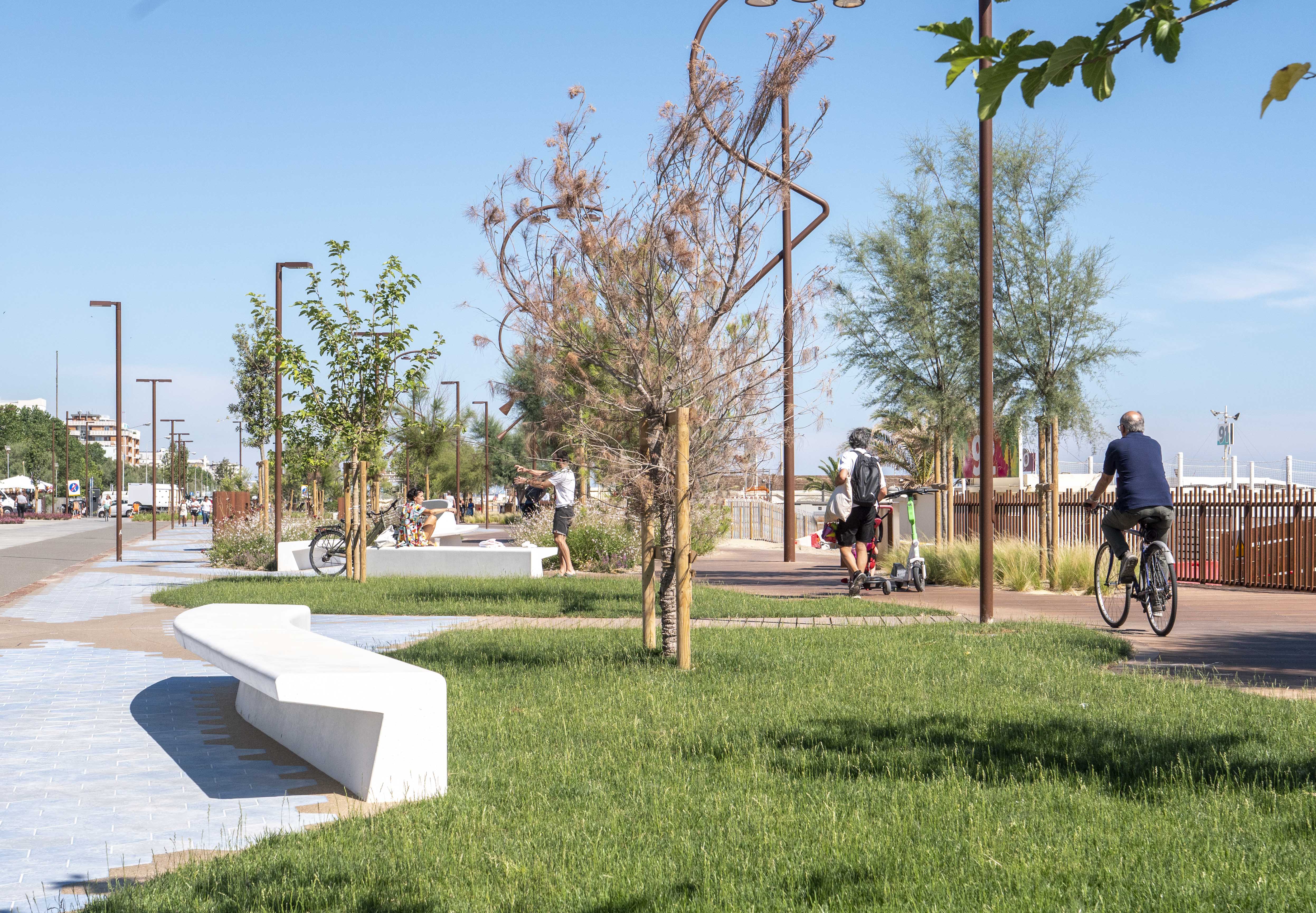 Anche il nuovo tratto 6 del lungomare si presenta infatti con una passeggiata pedonale in legno a ridosso dell’arenile, separata dalla pista ciclabile bidirezionale. Nella fascia centrale, la pavimentazione si sviluppa lungo un percorso sinuoso, tra le nuove aree dedicate al verde e agli alberi e una molteplicità di funzioni diverse, tra parchi giochi inclusivi e aree per l’attività fisica all’aperto. Questo tratto di Parco del Mare sarà infatti attrezzato per la pratica di alcune diffuse discipline outdoor. Aree aperte a tutti e in grado anche di ospitare future manifestazioni ed eventi sportivi. Attualmente sono in corso piccoli lavori di ultimazione e rifiniture in alcune zone del tratto.