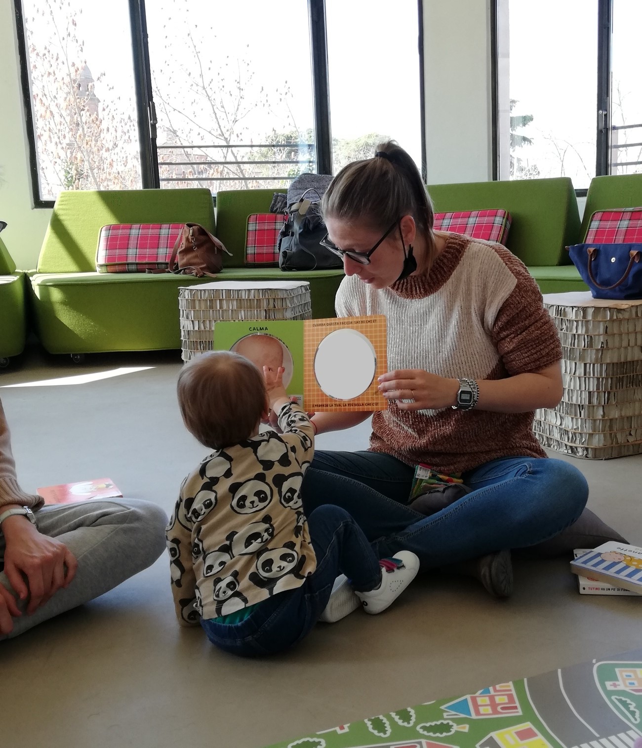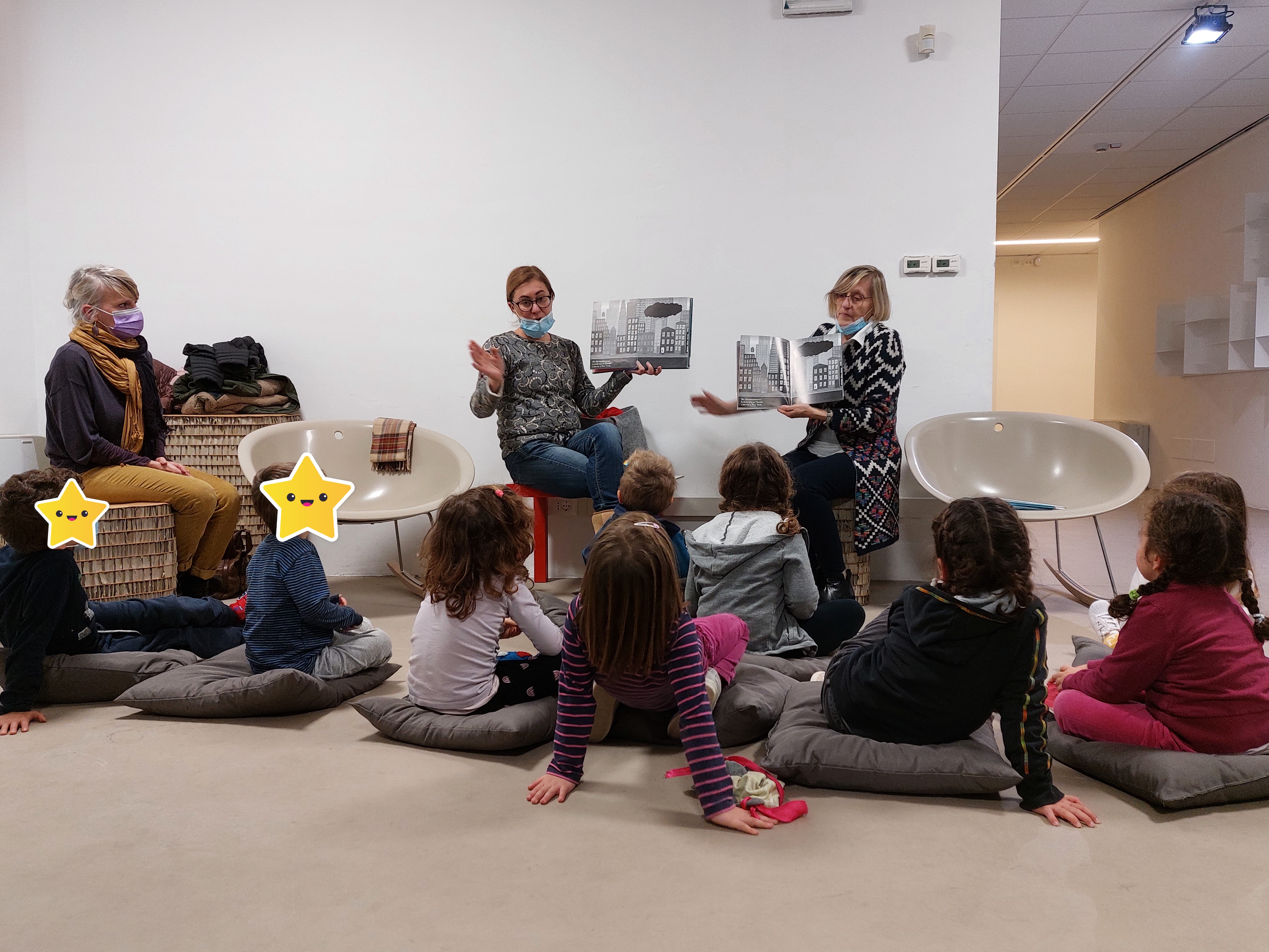 I lettori volontari della biblioteca leggono storie per i bambini presso la sala al terzo piano del Laboratorio Aperto Rimini Tiberio