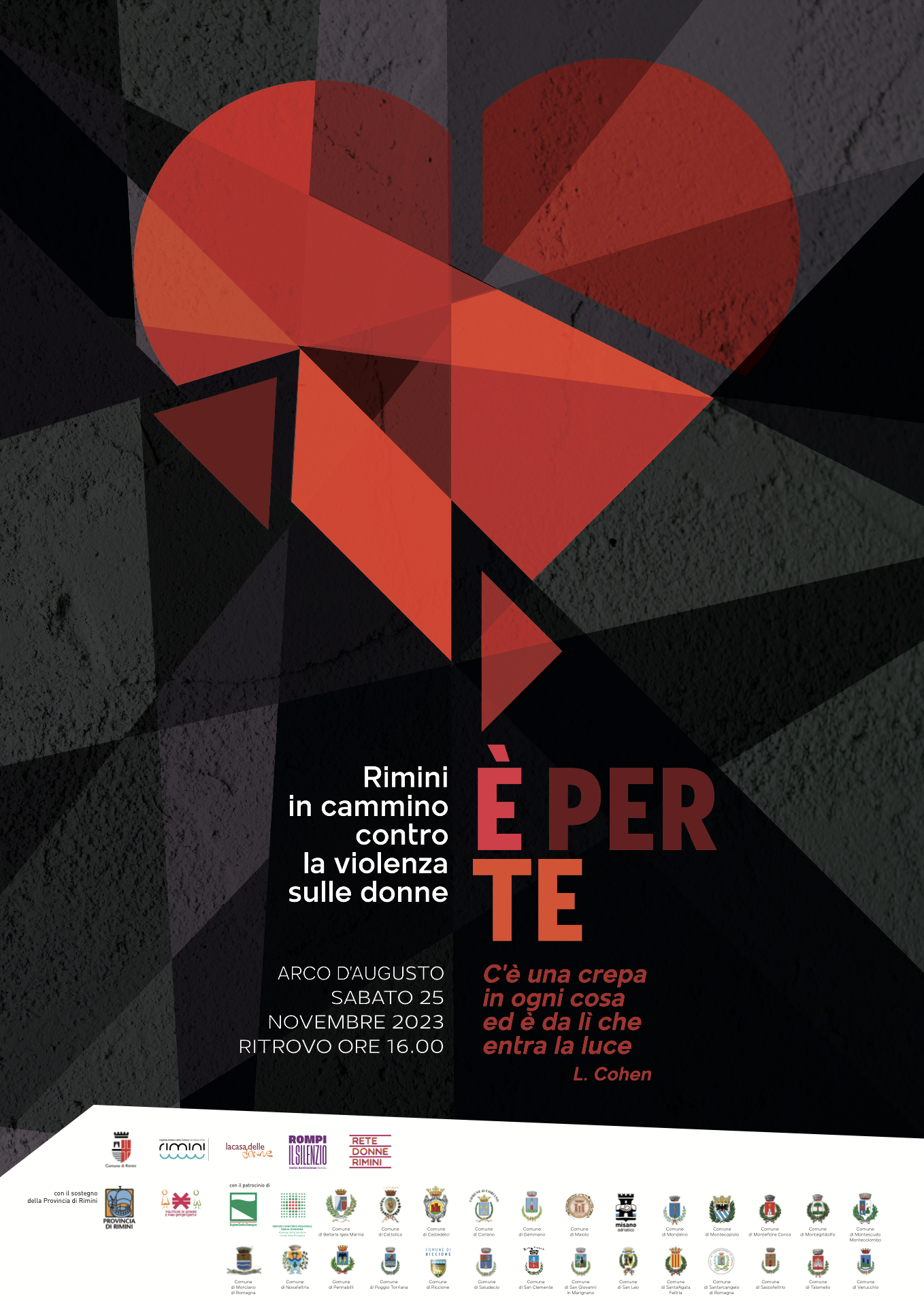 All’interno della Rassegna Donne coraggio! E in occasione della giornata internazionale contro la violenza sulle donne, è proposta anche quest’anno la camminata per le vie della città, con ritrovo all’Arco di Augusto alle ore 16.00 e partenza alle ore 16.30. La camminata termina in piazza Cavour in concomitanza con l’accensione delle luci di Natale. La novità di questa edizione è proprio legata all’accensione delle luci, vista la frase di Leonard Cohen “C’è una crepa in ogni cosa, ed è da li che entra la luce”, scelta come titolo delle iniziative dedicate alle donne vittima di violenza. Orario: dalle 16 alle 18. nfo: 0541 704545 www.facebook.com/casadelledonnerimini/?locale=it_IT