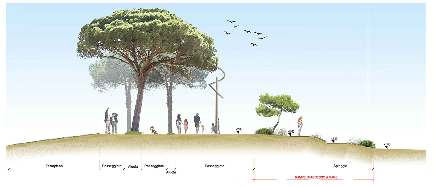 La riqualificazione complessiva di tutto il fronte mare del lungomare Sud, con la creazione di un sistema continuo tra l’attuale sedime stradale e la spiaggia e la pedonalizzazione, prevede la riorganizzazione delle attività turistico-ricettive in un’area verde attrezzata, di alto livello qualitativo. La mitigazione degli effetti dell'ingressione marina è prevista mediante innalzamento della quota di calpestio attuale, anche al fine di assolvere alla duplice funzione di maggior permeabilità visuale e di protezione passiva delle attività che andranno a insediarsi in tale area una volta pedonalizzata e riqualificata.