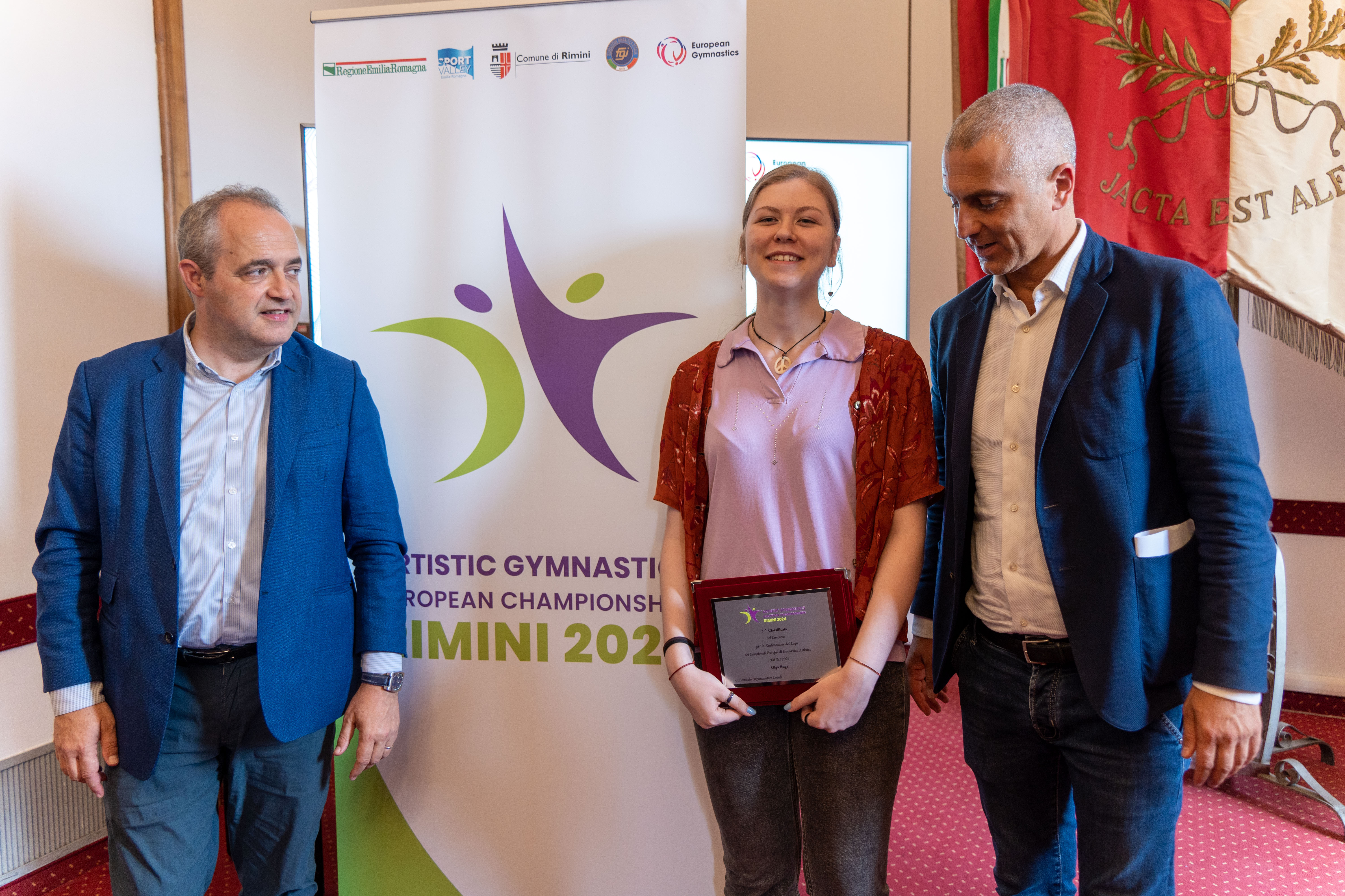 In conferenza è stato presentato il logo ufficiale della manifestazione, scelto tra le proposte pervenute all’apposito concorso indetto tra le scuole della zona. Il logo è stato disegnato da Olga Buga, studentessa della 3^C del Liceo Artistico Volta - Fellini di Riccione (Rimini). La forma ricorda quella di una stella in cui si inseriscono forme posizionate in modo da ricordare il saluto delle atlete e degli atleti in uscita dagli esercizi. Olga Buga è stata premiata con una targa.