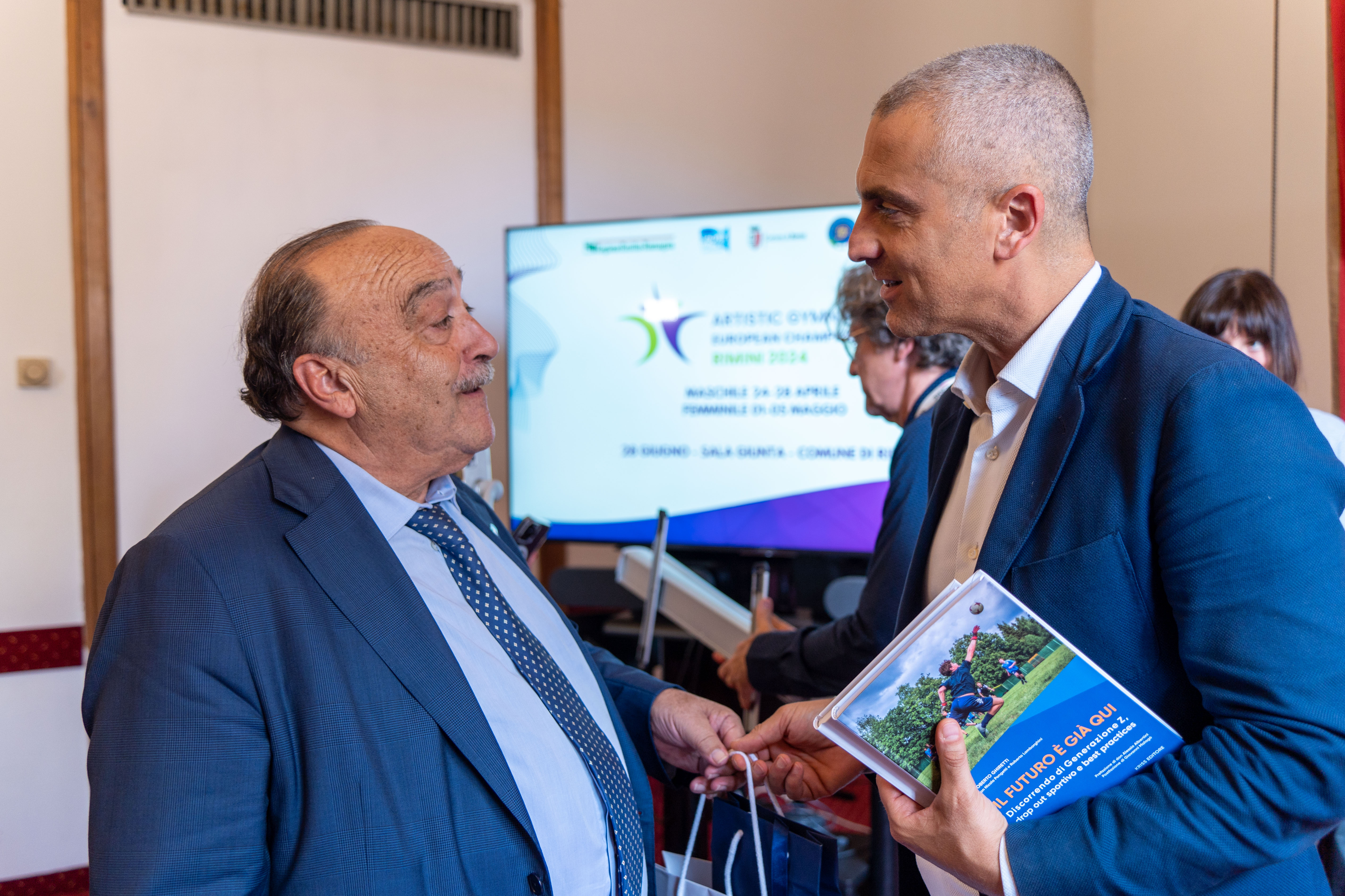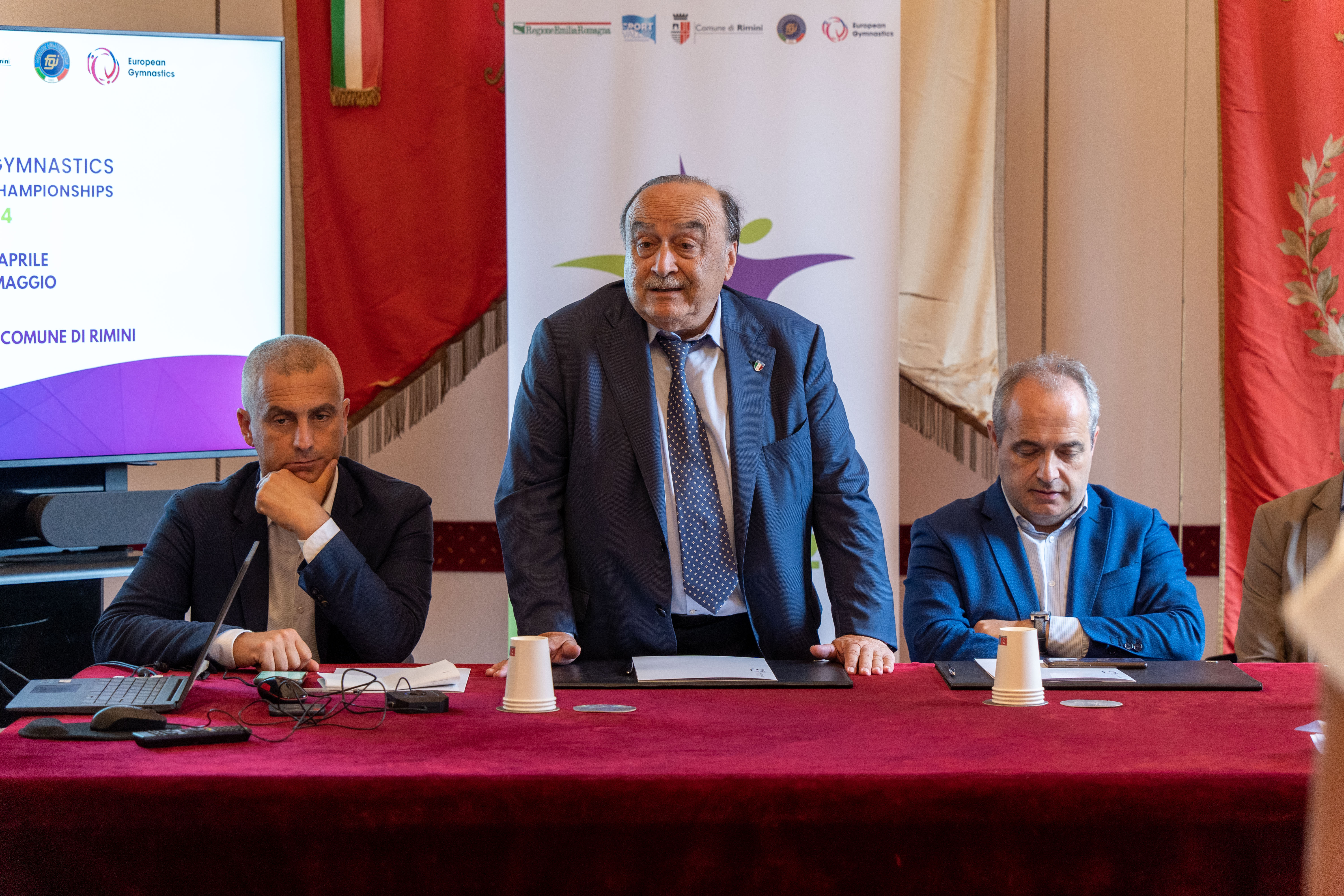 Si è svolta oggi, nella Sala Giunta del Comune di Rimini, la presentazione del 36° Campionato Europeo di Ginnastica Artistica Maschile (24-28 aprile 2024) e del 35° Campionato Europeo di Ginnastica Artistica Femminile (1-5 maggio 2024) in programma presso i padiglioni della Fiera di Rimini. Erano presenti il Sindaco di Rimini Jamil Sadegholvaad, il Capo della Segreteria Politica della Presidenza della Regione Emilia-Romagna Giammaria Manghi, il Presidente della Federazione Ginnastica d’Italia Gherardo Tecchi, il Presidente del Comitato Organizzatore dei Campionati Europei Marco Borroni e l'Assessore allo Sport del Comune di Rimini Moreno Maresi; insieme a loro le atlete della Nazionale Italiana di Ginnastica Artistica Femminile, protagoniste indiscusse delle ultime edizioni dei Campionati Europei.