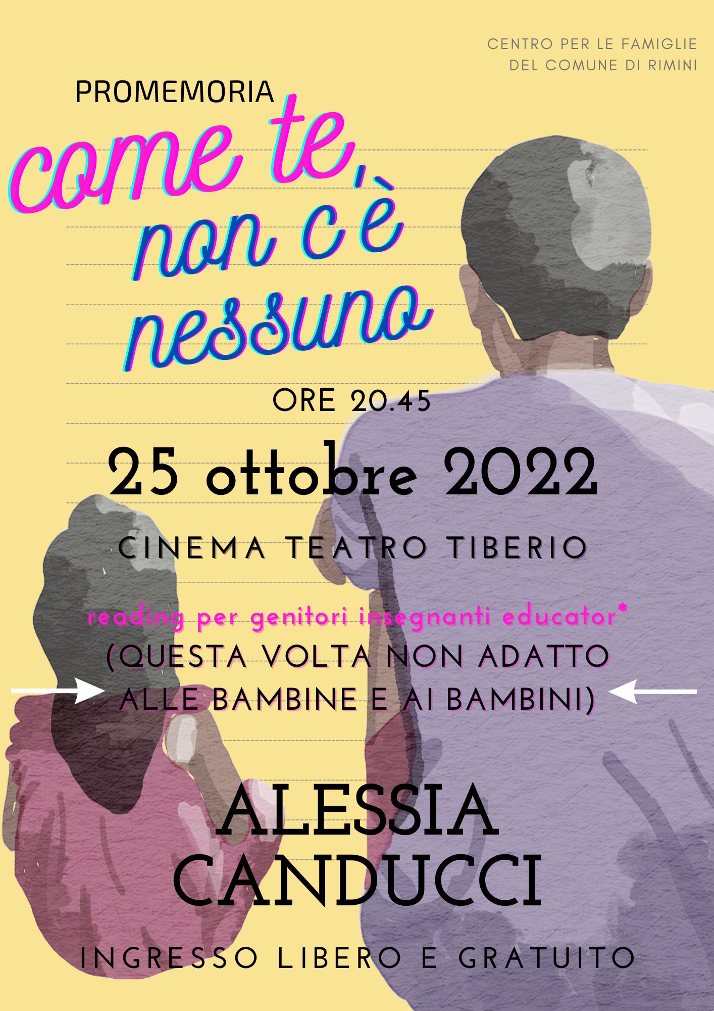 Evento inaugurale martedì 25 ottobre al Cinema Teatro Tiberio (ore 20.45) con il reading realizzato insieme ad Alessia Canducci dal titolo Come te non c’è nessuno, amori e fatiche in famiglia. Una carrellata emozionante e coinvolgente attraverso una selezione di albi illustrati e romanzi, dedicato all’impegno degli adulti quotidianamente si impegnano per educare, ascoltare e comprendere bambine e bambini, attraverso le vicissitudini della crescita e di questo particolare momento storico. Per le riflessioni proposte l’appuntamento è riservato agli adulti.