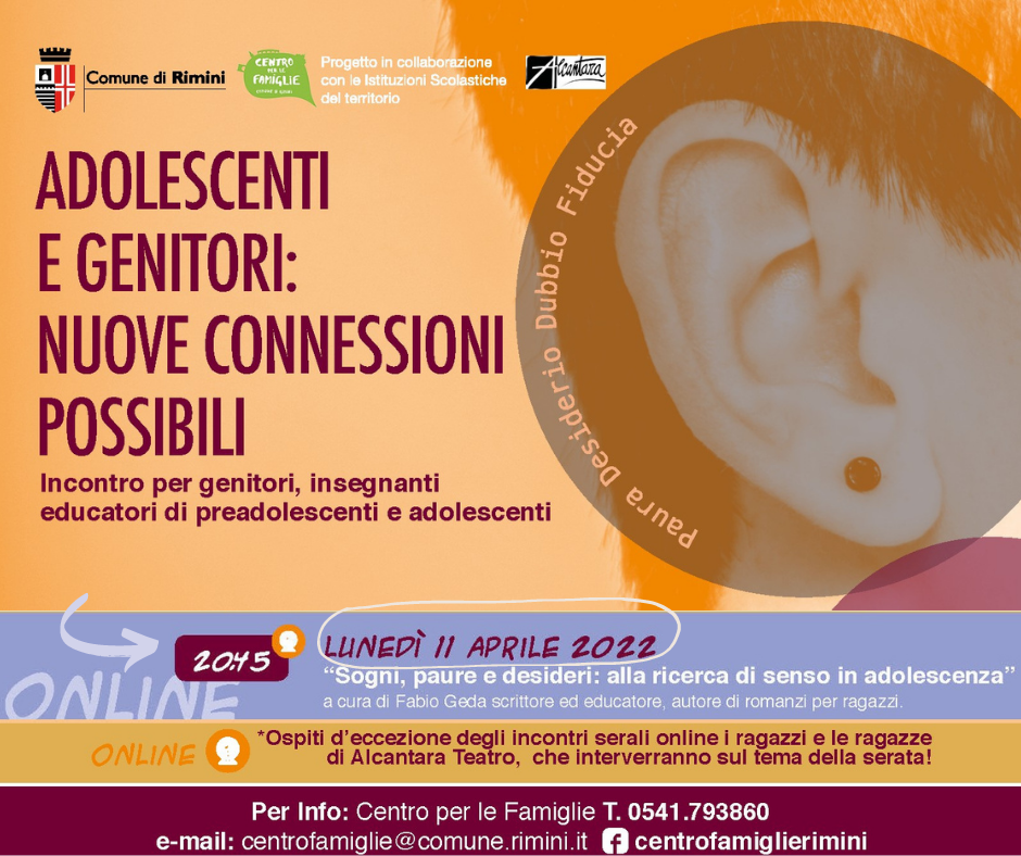 Un doppio appuntamento per il mese di aprile all’interno del percorso organizzato dal Centro per le Famiglie del Comune di Rimini “Adolescenti e genitori: nuove connessioni possibili”, realizzato in collaborazione con Alcantara Teatro dedicato a genitori, insegnanti ed educatori di ragazzi preadolescenti e adolescenti.