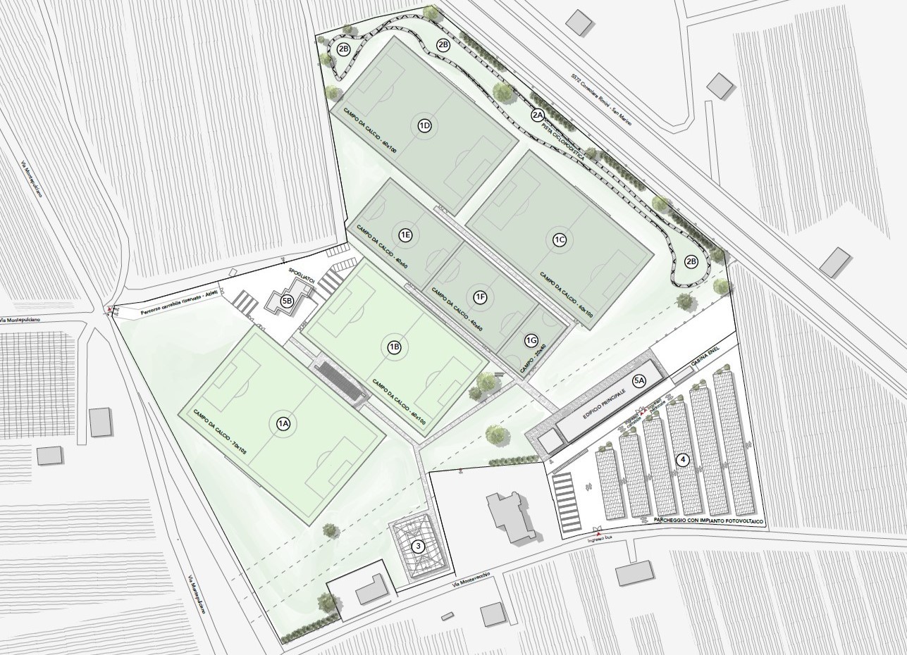 L’obiettivo è rigenerare l’intera area, trasformandola in uno spazio di aggregazione e socializzazione per la comunità, concepito per rispondere alle attuali esigenze sportive e ricreative. In particolare, il progetto prevede la costruzione di otto campi da calcio, di cui quattro da 11 giocatori (due in erba naturale e due sintetica); due campi da 7 giocatori in sintetico; e due campi da calcetto (5 giocatori), di cui uno polivalente, da coprire con pallone nei mesi invernali. Oltre a questo il progetto prevede tre campi da padel e una pista ciclopedonale. Sarà realizzata una tribuna per il pubblico dei due campi principali e sarà mantenuto, con possibile ampliamento, il parcheggio esistente, dotato di impianto fotovoltaico. L’area sarà completata con camminamenti e spazi verdi.