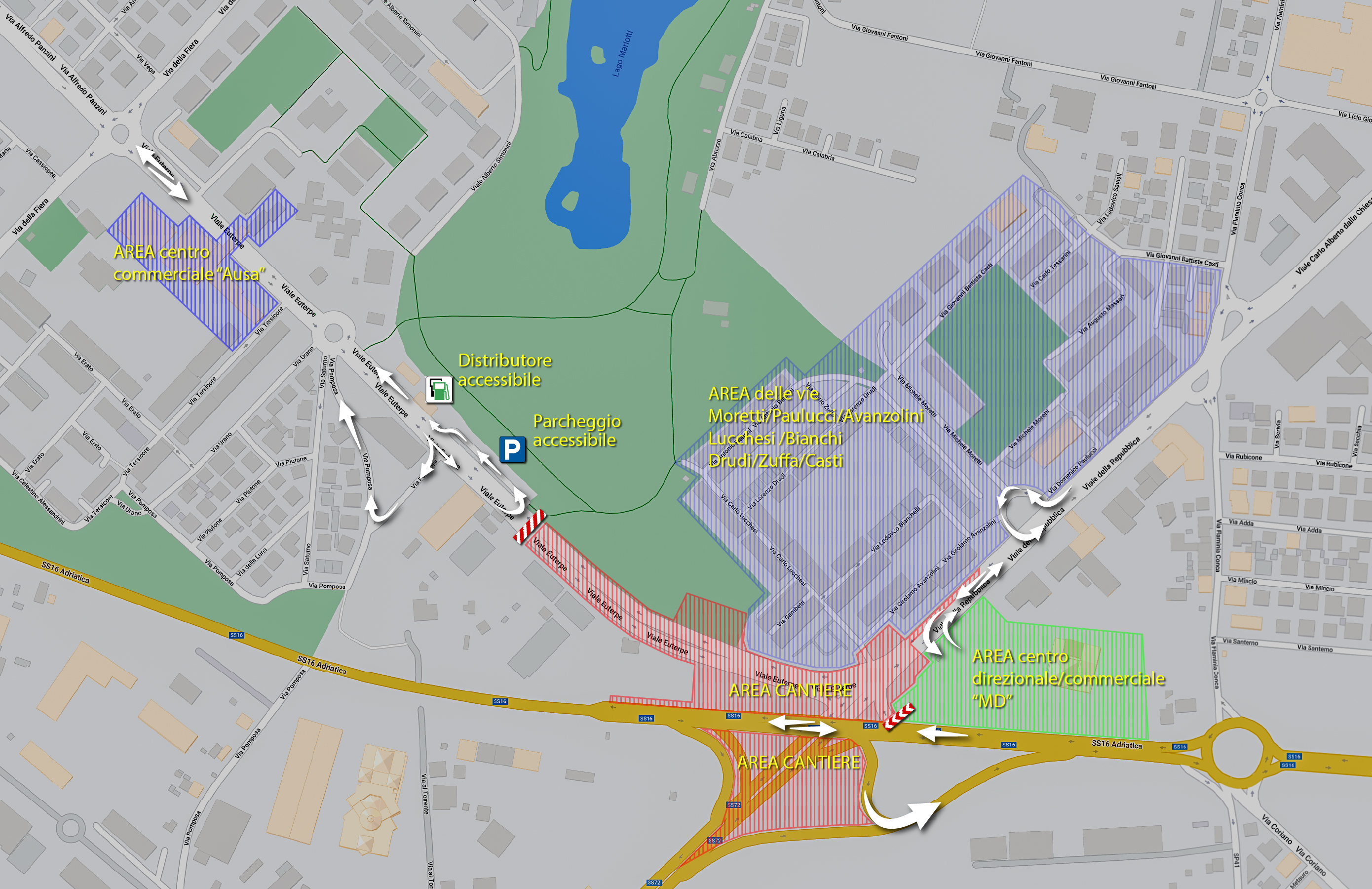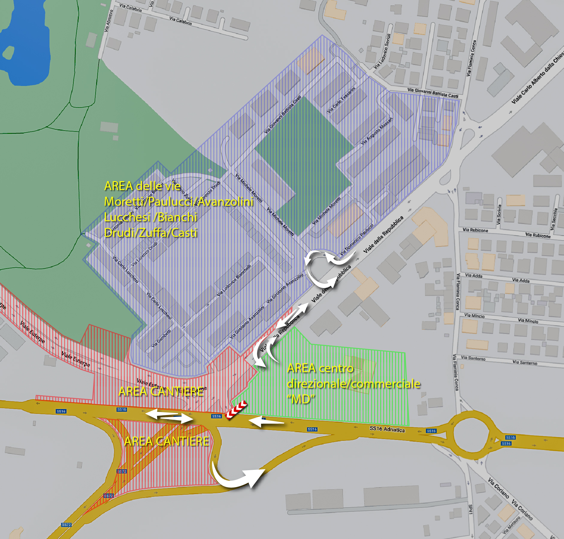 - per i veicoli provenienti da mare, la chiusura della via della Repubblica all'altezza di via Moretti/via Avanzolini: sarà consentito di proseguire solo ai veicoli diretti al centro direzionale/commerciale "MD";