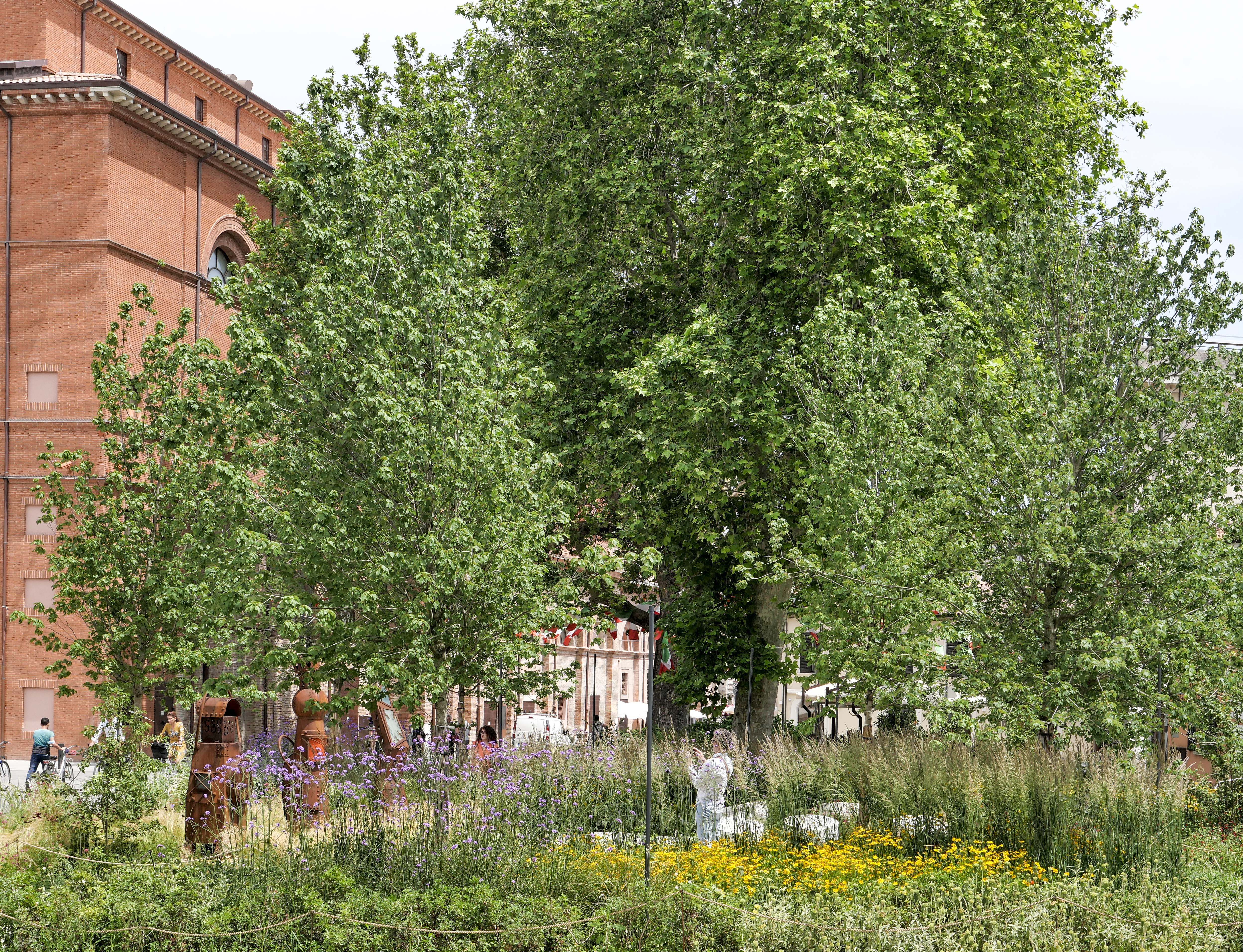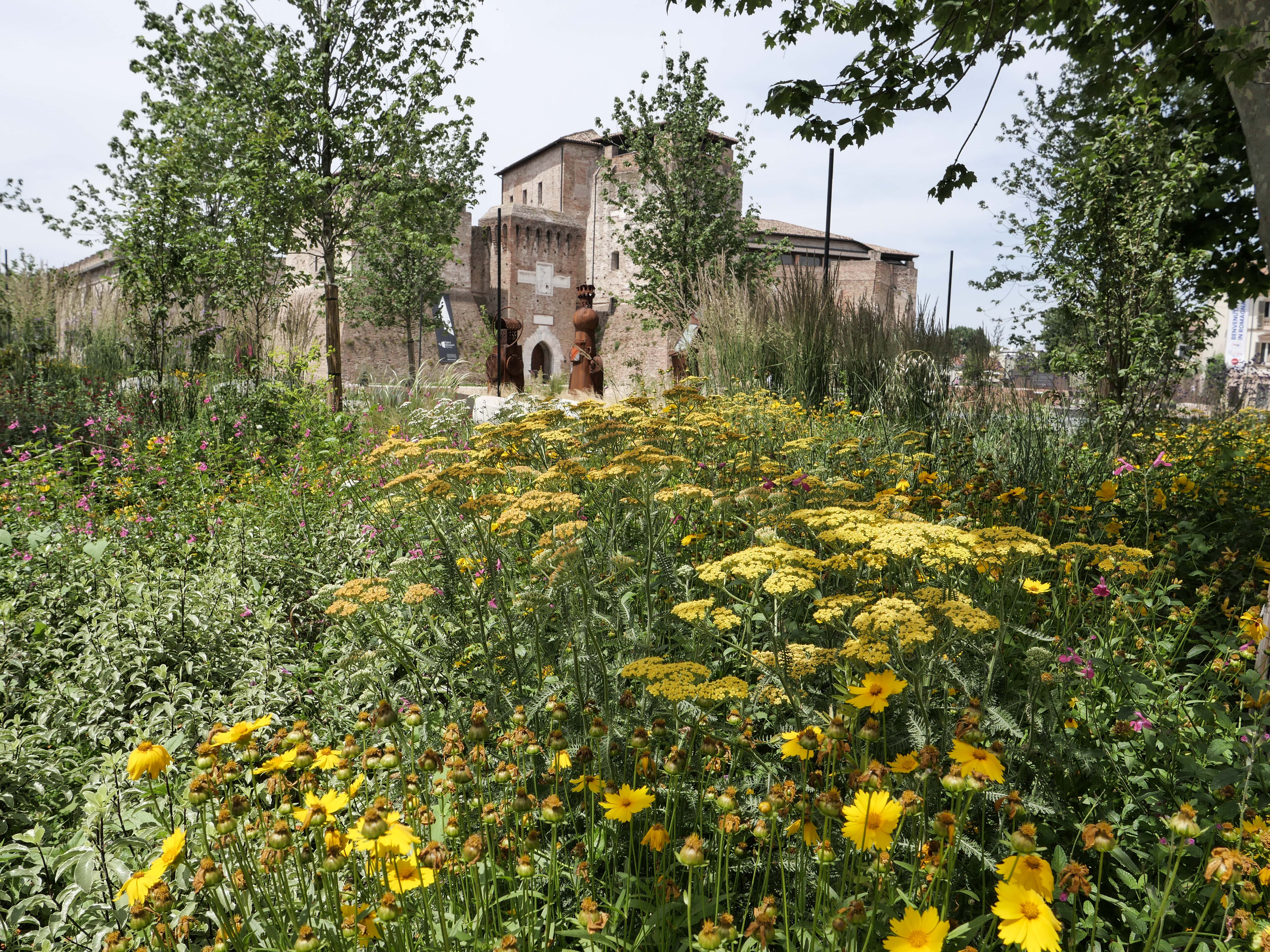 Un intervento per il quale l’Amministrazione comunale si è distinta con un lavoro straordinario di valorizzazione dello spazio rievocativo della “campagna felliniana” in piazza Malatesta, che ha visto restituire una porzione di città storica, prima pavimentata e dedicata alla viabilità, alla "prima campagna" riminese tramite l'introduzione, nell’area posta a sud del teatro Galli, di un "triangolo verde” caratterizzato dalla messa a dimora di un tappeto verde in cui sono inserite specie erbacee e arbustive (vegetazione bassa) e nuove alberature di acero che valorizzano la presenza del Platano centenario di particolare interesse storico, culturale e paesaggistico, che rimane il fulcro della geometria di quella porzione di piazza. Un’importante azione di depaving (de-sigillatura) che consiste nel restituire spazi permeabili (circa 700 metri quadrati) alla città e allo spazio urbano prima pesantemente impermeabilizzato.