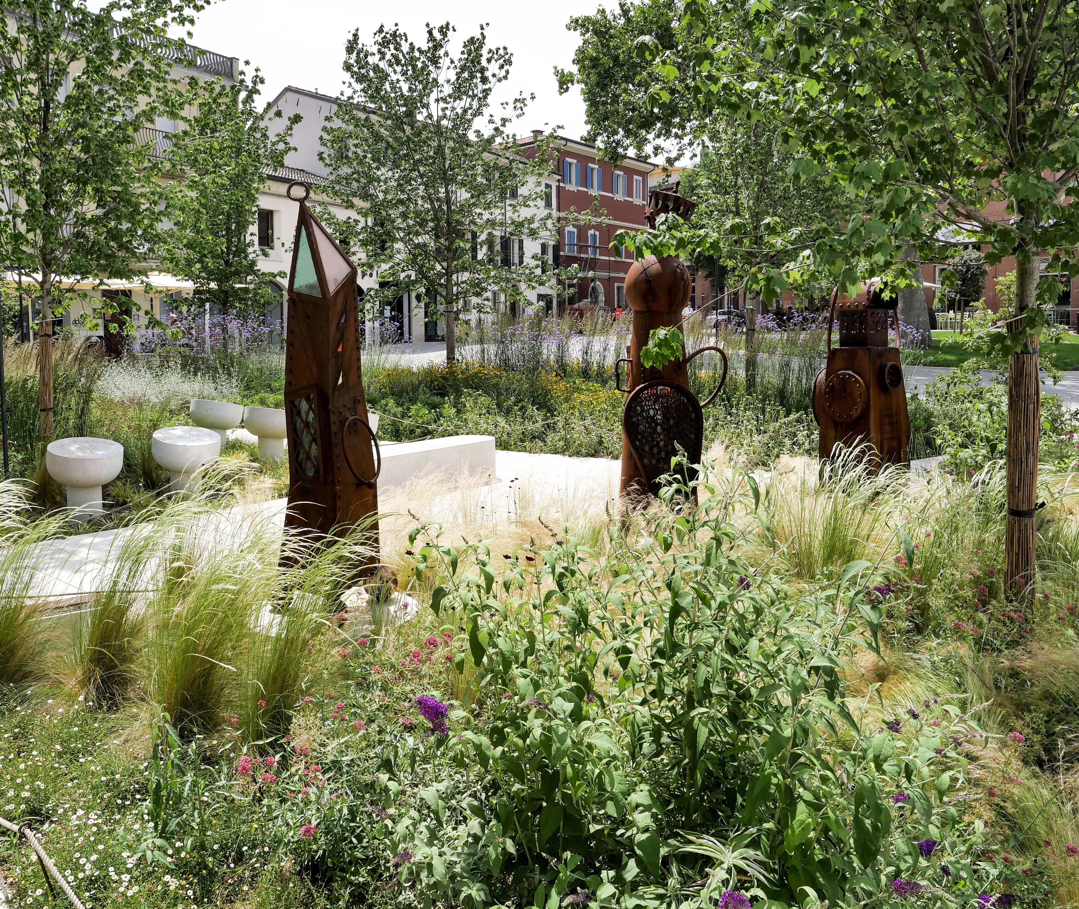 La scelta botanica delle specie che caratterizzano il "triangolo verde" risponde alla volontà di restituire alla piazza atmosfere diverse durante le fasi dell’anno e si ispira ai progetti sospesi di Tonino Guerra, a completamento del polo museale diffuso Fellini Museum, con i fiori di pietra illuminati da tre lanterne in ferro battuto e vetro dedicate allo scrittore russo Lev Tolstoj.