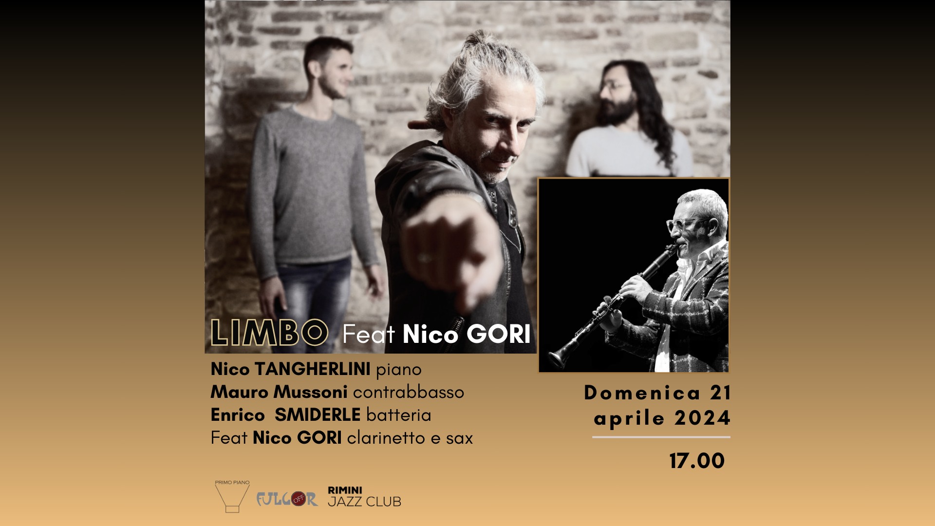 domenica 21 aprile, ore 16.00, Mauro Mussoni trio | LIMBO: Mauro Mussoni contrabbasso, Nico Tangherlini piano, Enrico Smiderle batteria - Feat.Nico Gori clarinet, sax