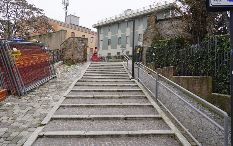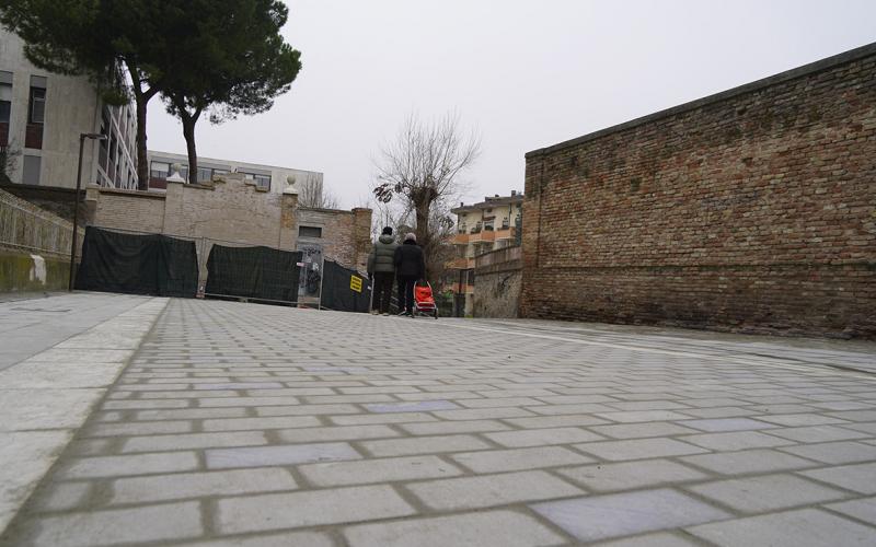 Una ristrutturazione particolare, impreziosita da un pattern centrale di sfumature azzurre - realizzate grazie all'inserimento di piccole elementi di marmo azul - che richiamano le proporzioni strette e lunghe dello scomparso campo di gioco, che una volta era presente nella zona retrostante, ora occupata dalla Ausl. L’intervento ha previsto anche la realizzazione di una nuova illuminazione della piazza con faretti più performanti, incassati a terra per illuminare scenograficamente il muro storico dei Bastioni e la facciata dell'ex Sferisterio.