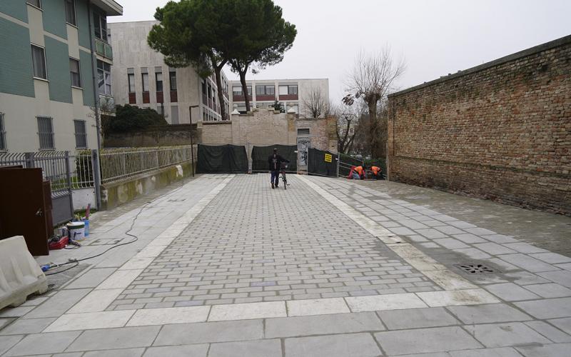 La piazzetta con la facciata dell'ex Sferisterio infatti è stata riqualificata con una nuova pavimentazione caratterizzata da una cornice rettangolare in pietra lessinia bianca, modulata sulle sue proporzioni architettoniche.