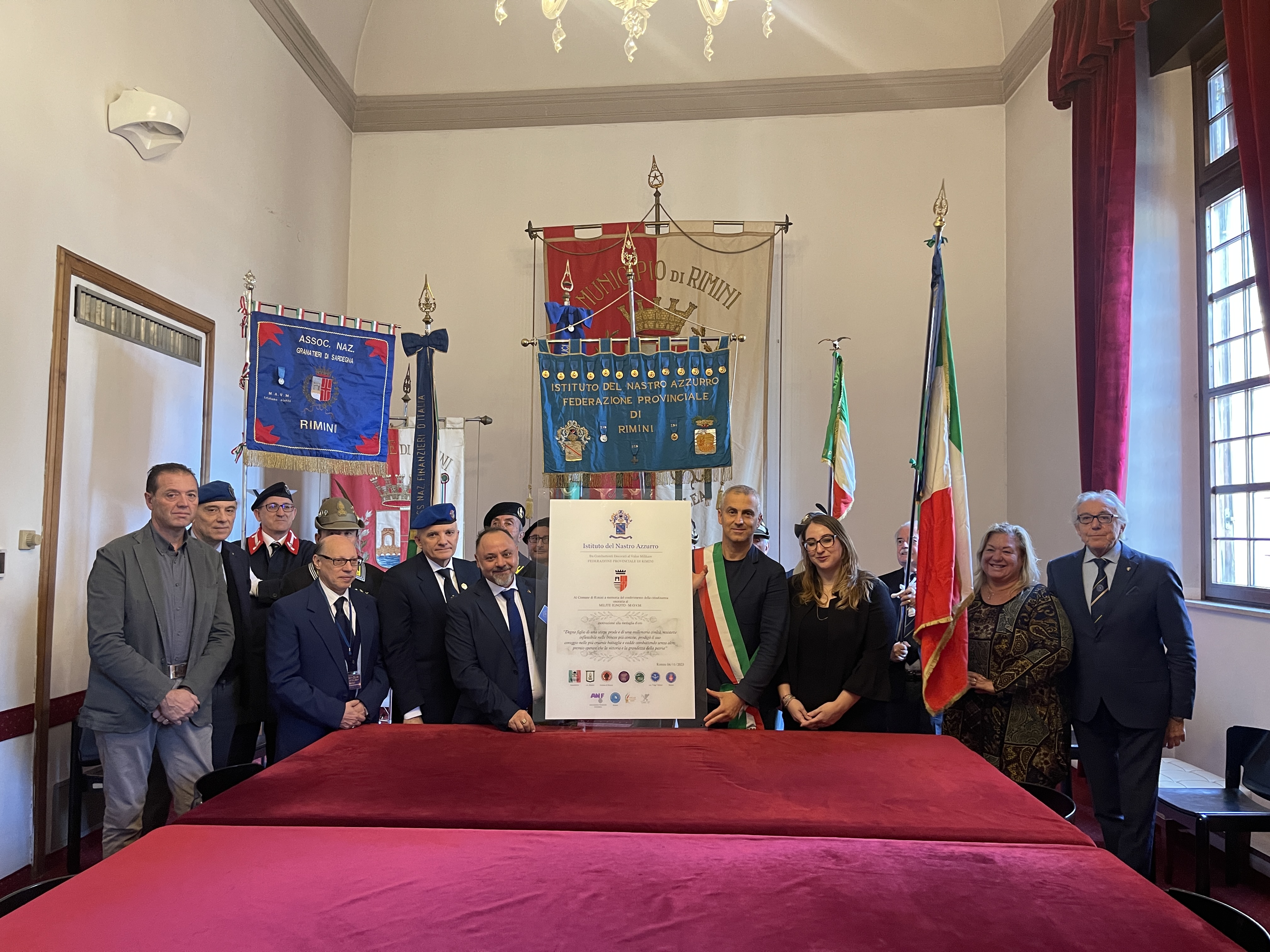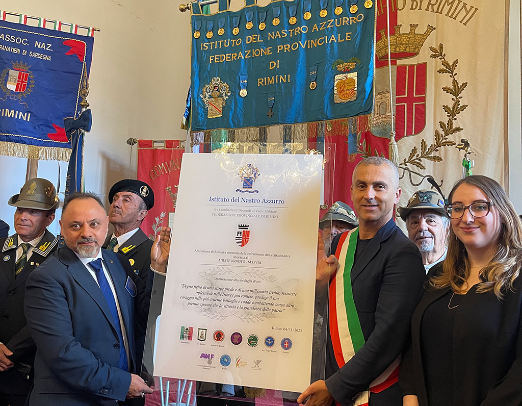 Si è svolta stamane nella sala della Giunta la consegna al Sindaco del Comune di Rimini Jamil Sadegholvaad della targa in ricordo del Milite Ignoto, a cui l’amministrazione comunale, già due anni fa, ha intitolato i giardini davanti alla scuola primaria Enrico Toti.