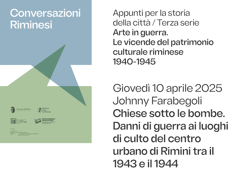Ne parlerà, giovedì 10 aprile, alle ore 17 (Sala della Cineteca), Johnny Farabegoli, architetto, responsabile dell’Ufficio beni culturali della Diocesi di Rimini, nella conferenza “Chiese sotto le bombe. Danni di guerra ai luoghi di culto del centro urbano di Rimini tra il 1943 e il 1944”, in cui affronterà il tema dei danni al patrimonio ecclesiastico, delle misure preventive adottate e dei successivi recuperi.