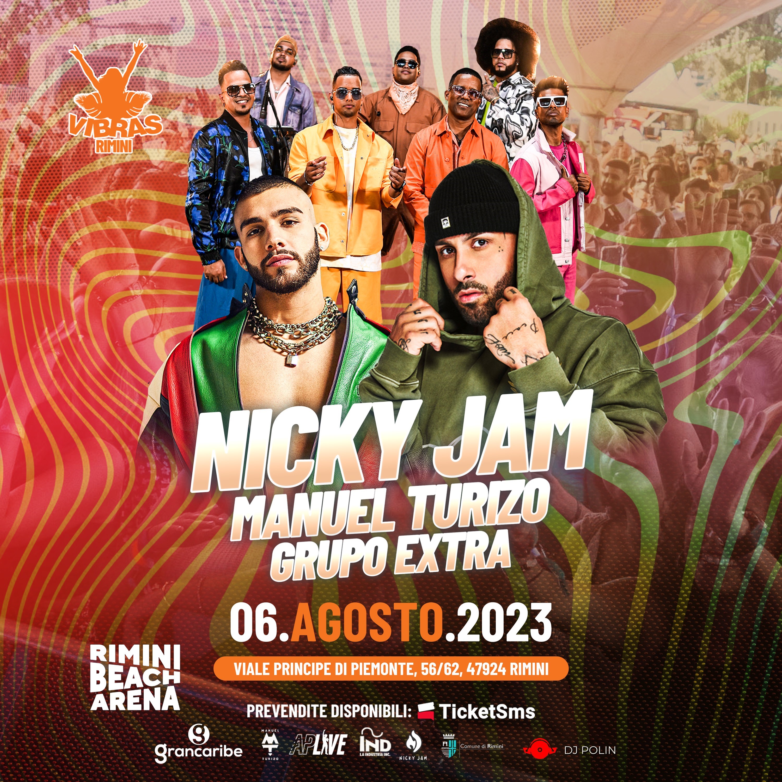 La musica sarà protagonista sulla spiaggia della Rimini Beach Arena, a Miramare, domenica 6 agosto con Vibras: le star della musica latina a Rimini. Sul palco saliranno alcuni tra gli artisti più famosi della musica latina, a patire dai Nicky Jam, pioniere della musica urban e del reggaeton, la star multiplatino Manuel Turizo e il Grupo Extra, con il loro brano "Me Emborracharé" che ha già raggiunto milioni di streaming. La serata sarà aperta da DJ Polin e propone una serie di affermati dj internazionali, tra cui DJ Bliss, DJ Jas, DJ Cochano, Cuban Flex e Grancaribe Staff.