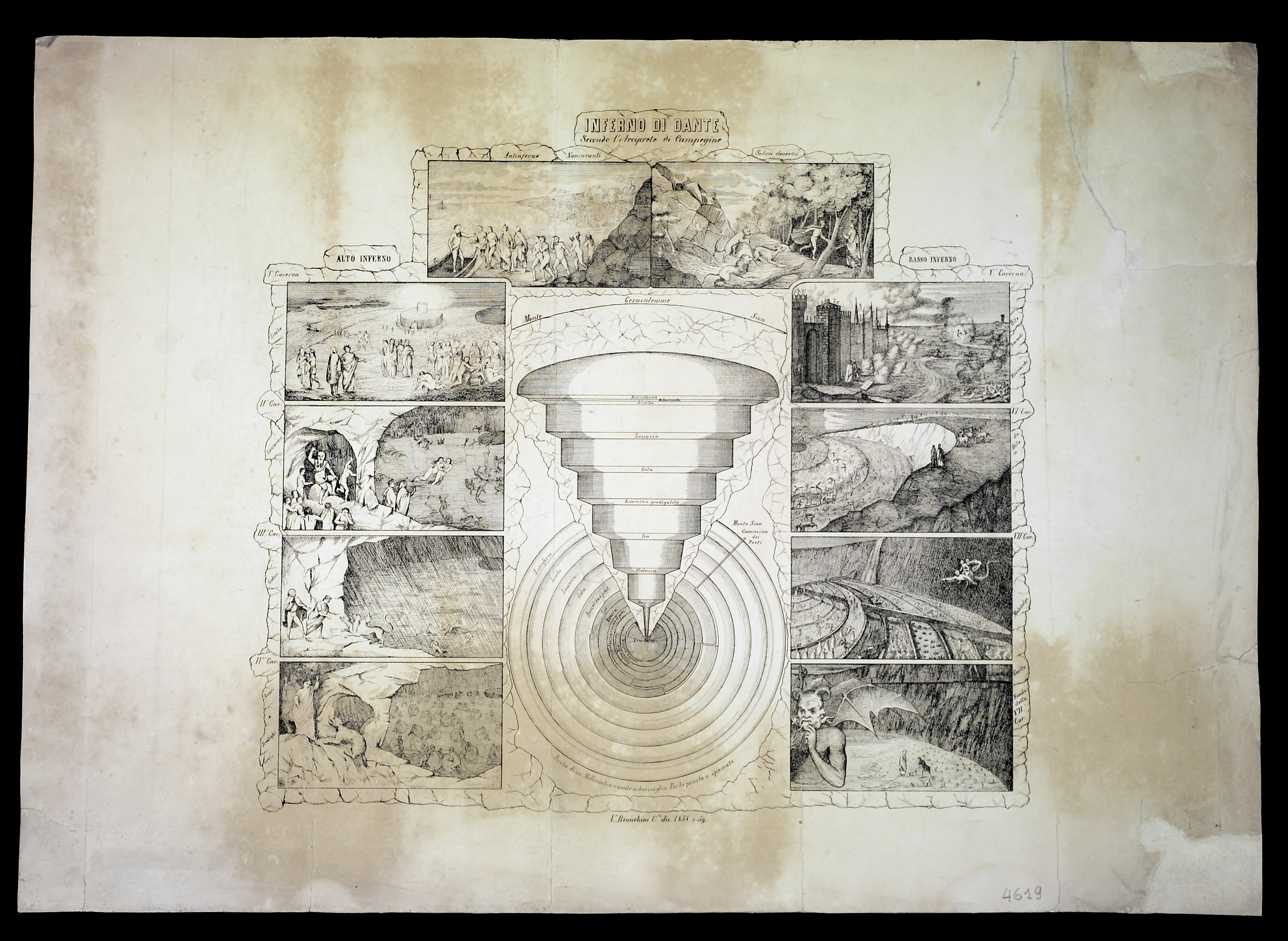 Nella stampa conservata in biblioteca, l’Inferno domina la parte centrale della composizione, incorniciato da dieci vignette che raffigurano, nella parte superiore, l’Antinferno e la selva oscura, mentre ai lati troviamo scene tratte dai canti I-VI, con due vignette dedicate al VII, tra cui quella delle Malebolge. Qui, i fossati concentrici dell’Inferno sono rappresentati come mura fortificate attraversate da ponti di roccia, evocando le strutture delle cittadelle medievali. I chiaroscuri della litografia trasmettono il senso di affanno, caos e dolore delle moltitudini dannate, le quali, pur immerse nella sofferenza, sembrano accettare con rassegnazione il proprio destino eterno.