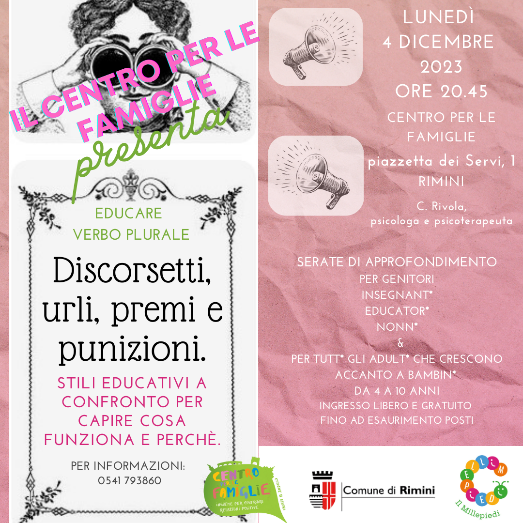 L’appuntamento è al Centro per le Famiglie, piazzetta dei Servi 1, lunedì 4 dicembre ore 20.45 con “Discorsetti, urli, premi e punizioni - stili educativi a confronto per capire cosa funziona e perché-“.