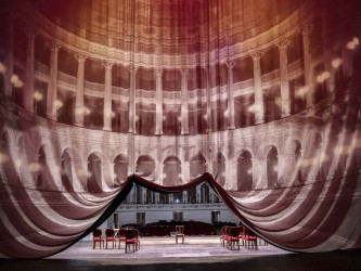 La storia del teatro di Rimini si intreccia così con Aroldo dando vita ad una nuova versione firmata da Emilio Sala e Edoardo Sanchi e con un’ambientazione storica fissata fra il maggio del 1936 e il dicembre del 1943. “Lo spettacolo sposta la storia al tempo della guerra d’Etiopia e della proclamazione dell’Impero e arriva alla seconda guerra mondiale - spiega Emilio Sala - Tutto parte dal ritorno di Aroldo come reduce di un’esperienza traumatica e arriva all’impressionante bufera del IV atto, con il coro che narra di un naufragio: lo abbiamo fatto diventare il bombardamento che rase al suolo la città di Rimini. Lo spettacolo si conclude con il crollo del Teatro Galli. Nelle rovine di quel mondo arrivano l’ex podestà e sua figlia Mina”. Inseriti in questo nuovo contesto spazio temporale, i personaggi acquisiscono un volto nuovo pur rimanendo strettamente correlati alla partitura dell’opera: Aroldo è un reduce dalla guerra coloniale d’Africa, affranto dalle atrocità vissute; Mina è una donna travolta dai sensi di colpa per l’adulterio commesso. E sarà proprio lei, grazie all’autenticità e alla determinazione del suo agire, ad innestare il perdono che coinvolgerà gli altri protagonisti maschili, in una sorta di catarsi finale. “Un altro elemento centrale della nostra drammaturgia - continua Emilio Sala - è il sipario storico, semidistrutto dal bombardamento e che, conservato dal custode del teatro, ha sempre costituito un elemento di spinta per la ricostruzione del teatro. Durante l’introduzione musicale sul boccascena completamente vuoto viene issata una riproduzione di questo sipario dipinta da quel grande pittore di scena che è Rinaldo Rinaldi. Lì appare un conferenziere, Ivano Marescotti, che ricorda quanto avvenuto”.