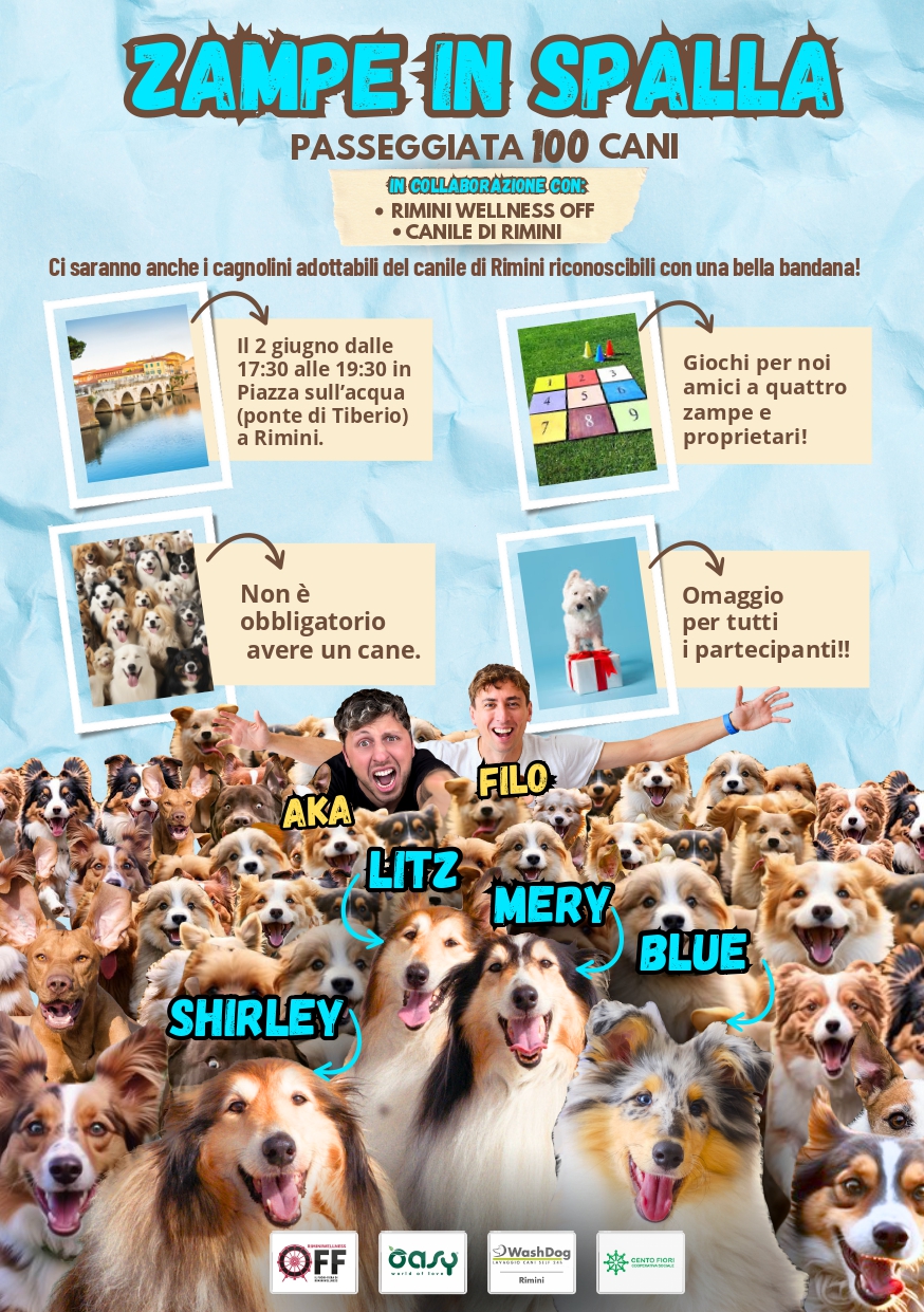 Organizzato in maniera congiunta con Comune di Rimini e con la Rimini Wellness OFF insieme a WashDog, Oasy (cibo per cani e gatti) e la cooperativa Cento Fiori, il raduno è in programma il 2 giugno alle ore 17.30 con ritrovo alla Piazza sull’Acqua, davanti al Ponte di Tiberio. Una volta lì, si dirà lo start a una serie di attività ludiche e sportive che si snoderanno al Parco XXV Aprile, per concludersi intorno alle 19.30.