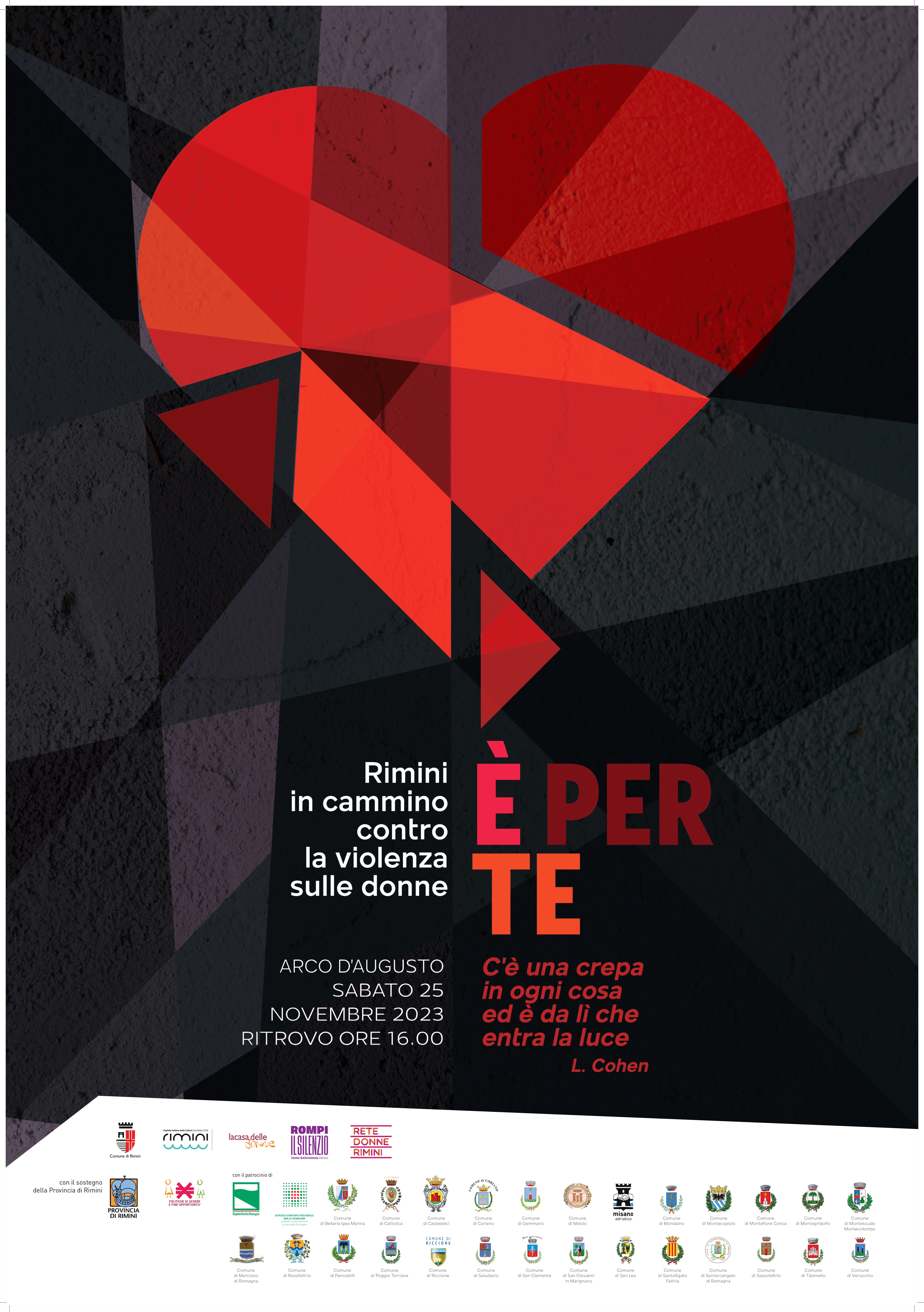 “E’ per te”, Rimini in cammino contro la violenza sulle donne. Ritrovo ore 16.00 all’Arco di Auguro, partenza alle 16.30 e, dopo un percorso nelle vie del centro, arrivo in piazza Cavour per l’accensione delle luci di Natale, alle ore 18.