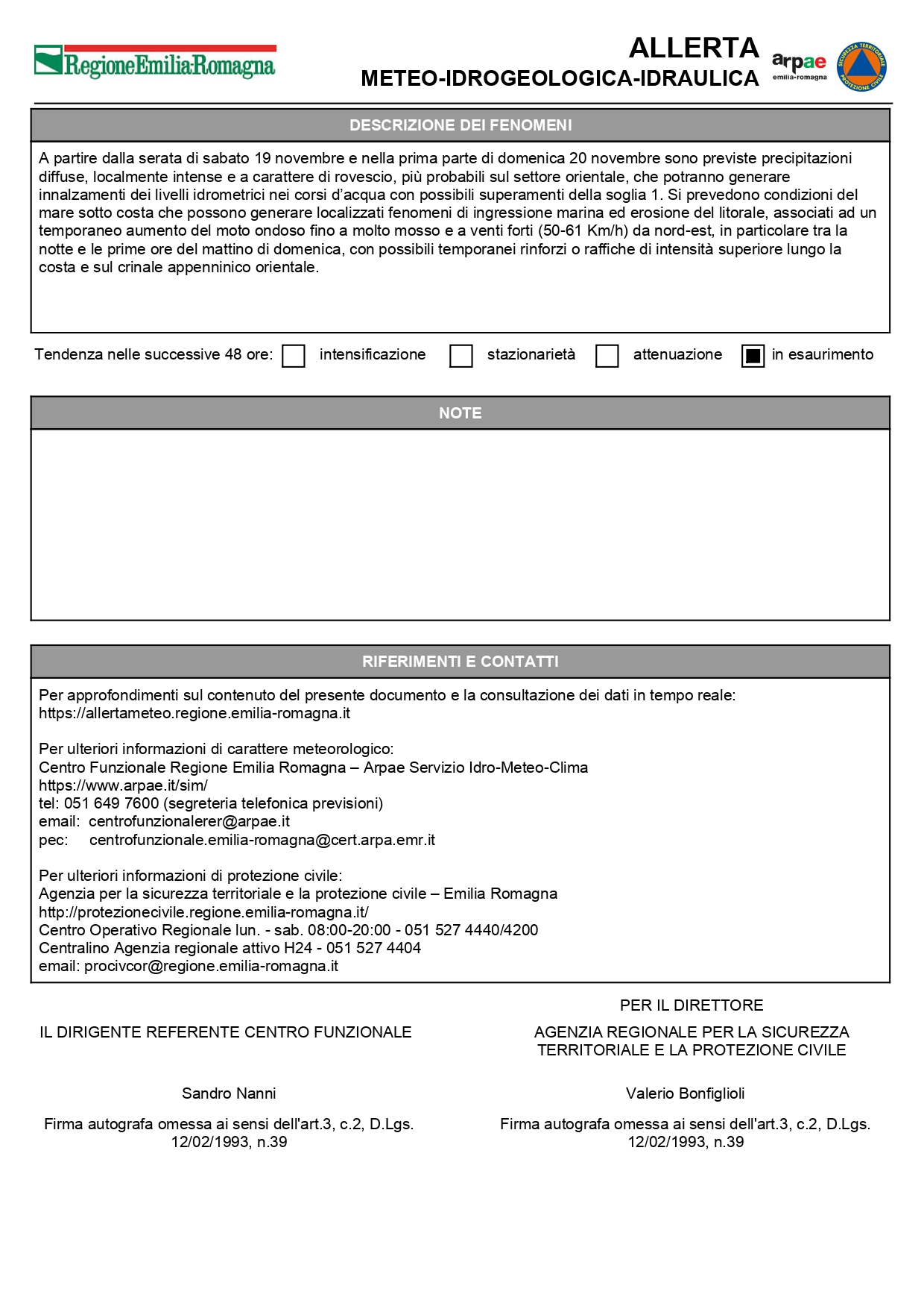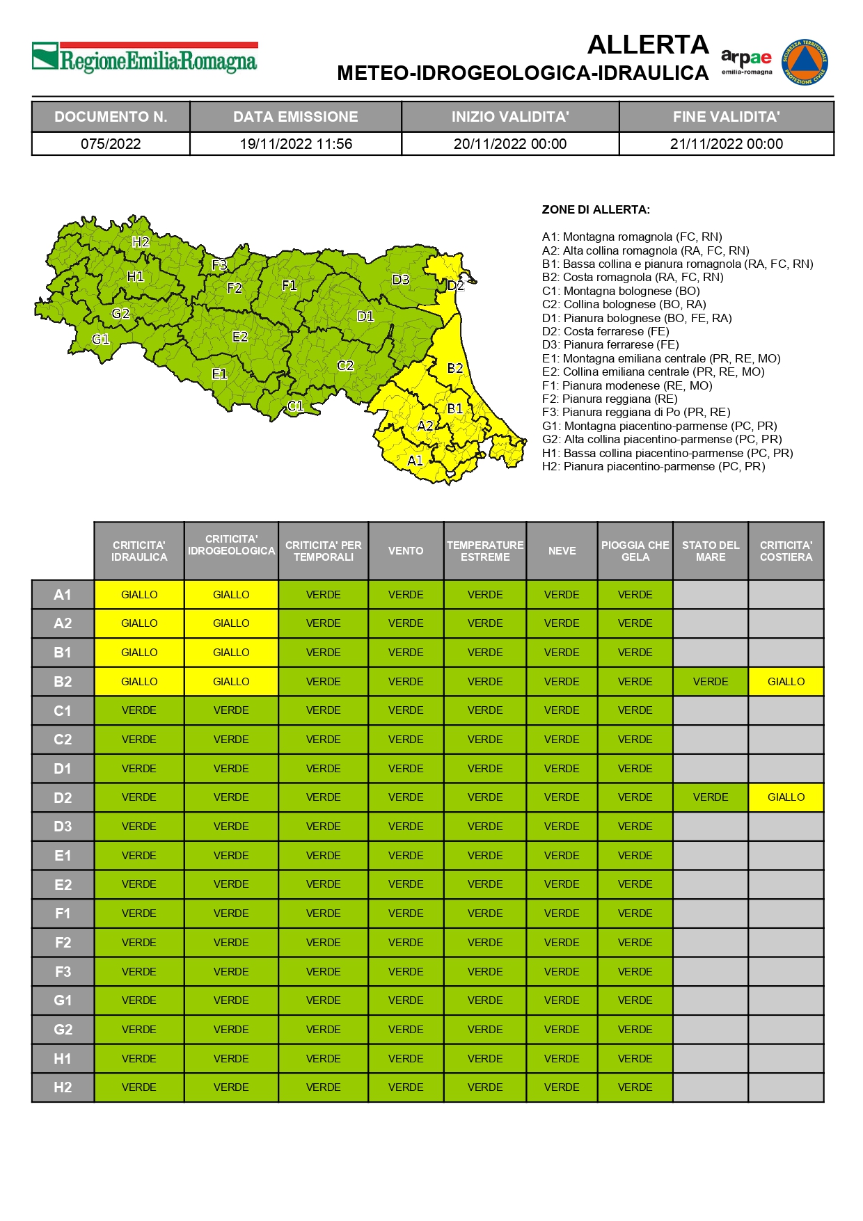 Emessa “Allerta Gialla” per criticità idrogeologica, idraulica e per criticità stato del mare per il giorno 20 novembre