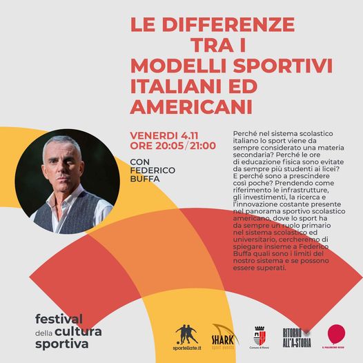 Alle 21 Federico Buffa (avvocato, telecronista e giornalista sportivo) parlerà delle differenze tra i modelli sportivi italiani ed americani.
