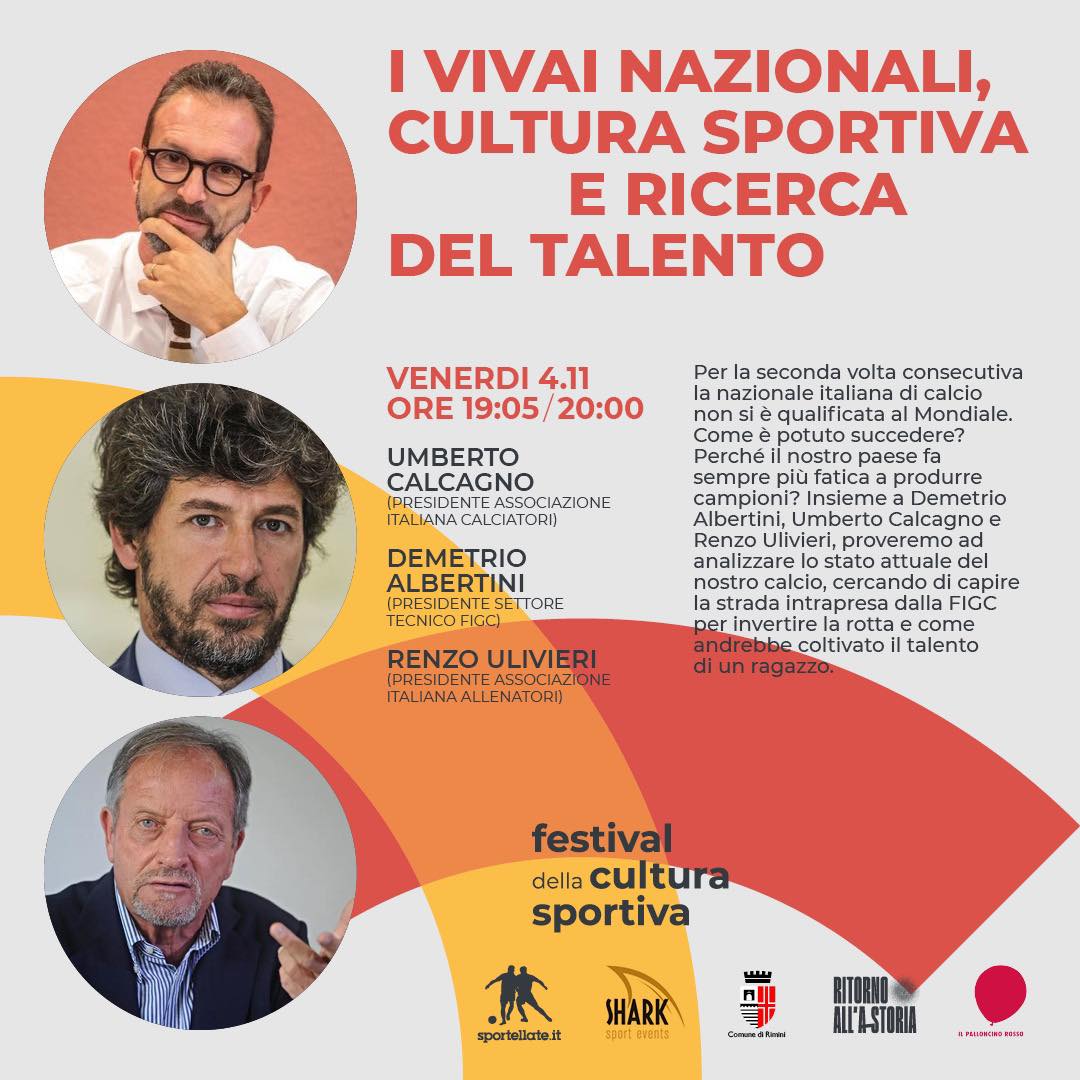 Dalle 19 alle 20, , Demetrio Albertini (presidente settore tecnico Figc), Umberto Calcagno (presidente Associazione Italiana Calciatori), e Renzo Ulivieri (presidente Associazione Italiana Allenatori) parleranno di “Vivai nazionali, cultura sportiva e ricerca del talento”.