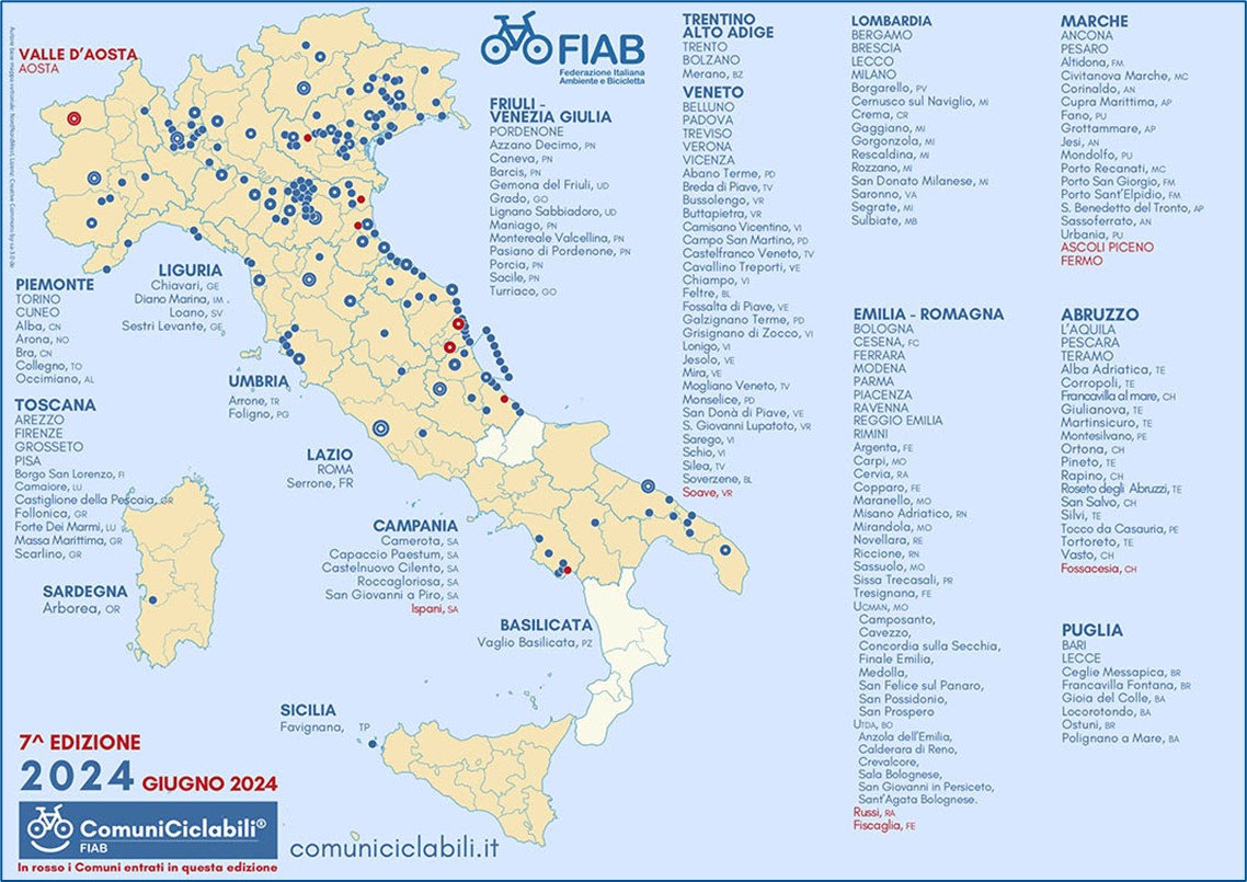 Tornando alle bandiere gialle Fiab, l’Emilia-Romagna si conferma la regione che anche nel 2024 ha il maggior numero di capoluoghi Comuni Ciclabili, oltre a Rimini ottengono il punteggio massimo Bologna, Piacenza, Parma, Reggio Emilia, Modena, Ravenna, Ferrara.