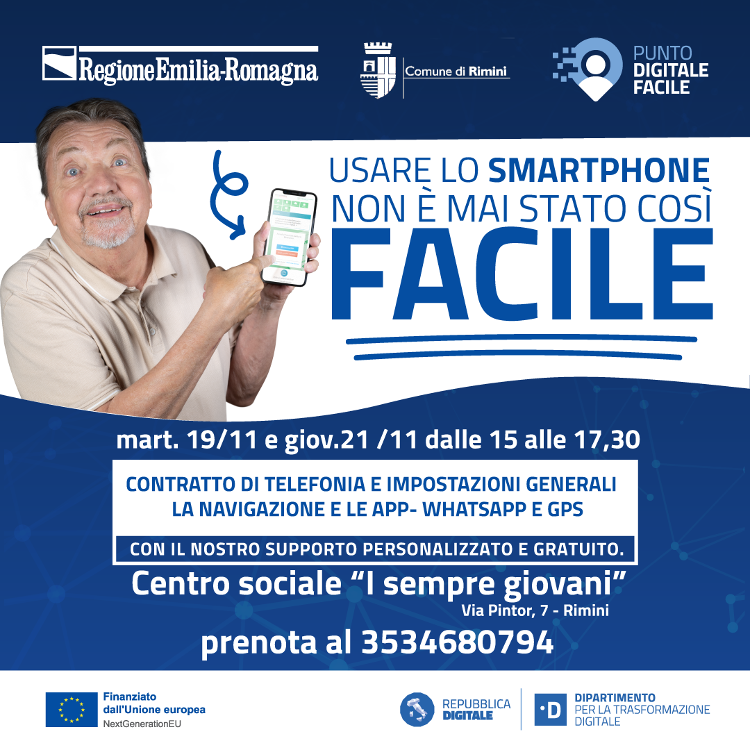 Sempre a novembre, prende il via il corso rivolto a chi ha poca dimestichezza con gli smartphone e vuole migliorare le proprie modalità di utilizzo, organizzato dagli sportelli Digitale Facile. Il corso tratterà i seguenti temi: contratto di telefonia e impostazioni generali del telefono, navigazione e uso delle app in modo particolare whatsapp e mappe gps.