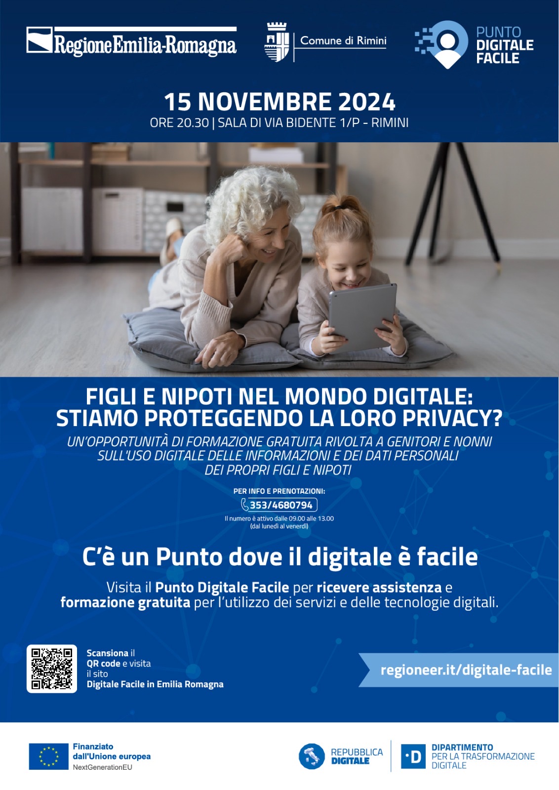 Figli e nipoti nel mondo digitale: stiamo proteggendo la loro privacy? E’ questo il titolo dell’incontro gratuito che si svolgerà il 15 novembre prossimo nell’ambito del progetto Digitale Facile.