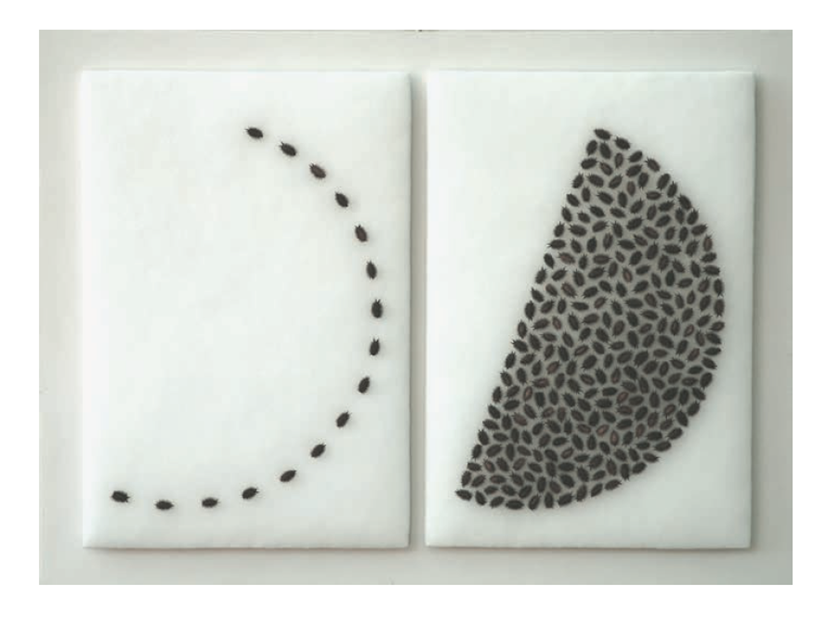 «C’è un lavoro di Luigi Poiaghi con un titolo che potrebbe apparire enigmatico: Se mi cerchi. Due semicerchi composti da semi di lappola trovati dietro casa e fissati su geotessuto: uno, solo tratteggiato e l’altro interamente realizzato con i semi in una sorta di trama “pointilliste, ma di una monocromia naturale, in senso proprio.