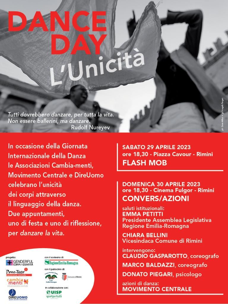 Il 29 aprile si festeggia in tutti i paesi del mondo la Giornata Internazionale della Danza, promossa dall'International Dance Council dell'UNESCO. In questa data si celebra la nascita di Jean-Georges Noverre (1727-1810), il più grande coreografo della sua epoca, il creatore del balletto moderno. In occasione di questa giornata, all’interno del progetto Genderful - Corpi/Identità, le Associazioni MOVIMENTO CENTRALE Teatro/Danza, CAMBIA-MENTI APS e DIREUOMO-Spazio Ascolto uomini maltrattanti in collaborazione con UISP TERRITORIALE RIMINI APS, con il sostegno della Regione Emilia-Romagna e il patrocinio di UPI Emilia-Romagna e del Comune di Rimini propongono due appuntamenti nelle giornate di sabato 29 e domenica 30 aprile.