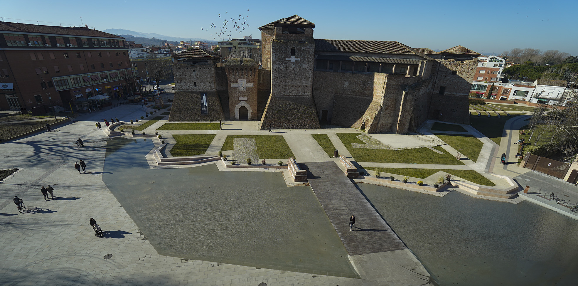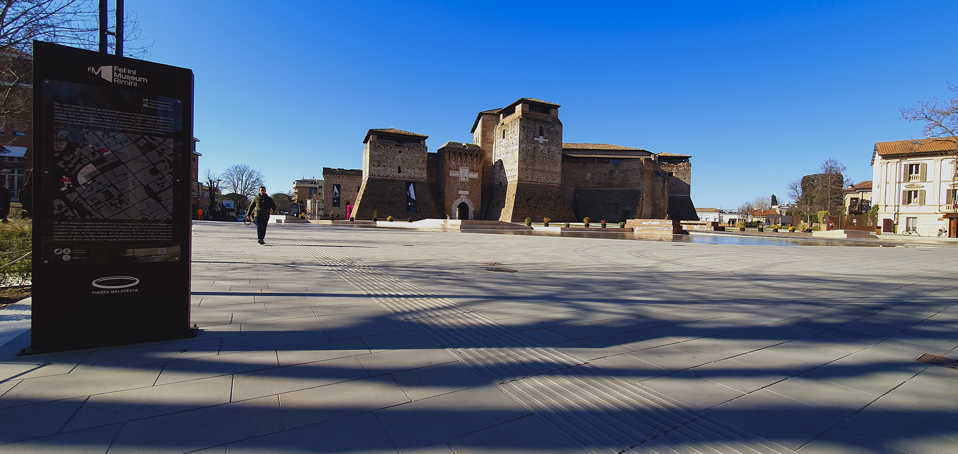 La nuova piazza Malatesta connette così gli altri due assi del Museo Fellini: il Palazzo Valloni, edificio di origine settecentesca dove ha sede il cinema Fulgor, e Castel Sismondo. I due spazi, che sono il luogo di una narrazione attraverso film, disegni, oggetti di scena, costumi, valorizzate con l’ausilio di tecnologie immersive e interattive.